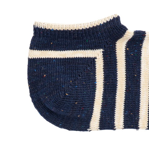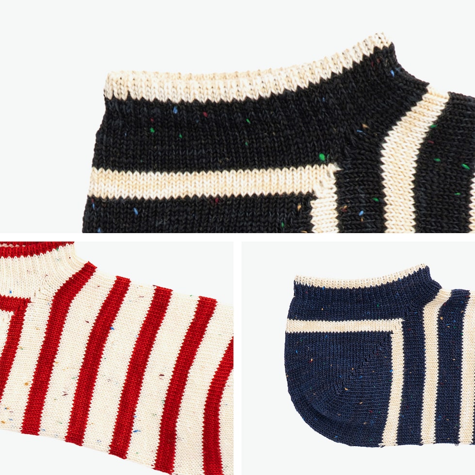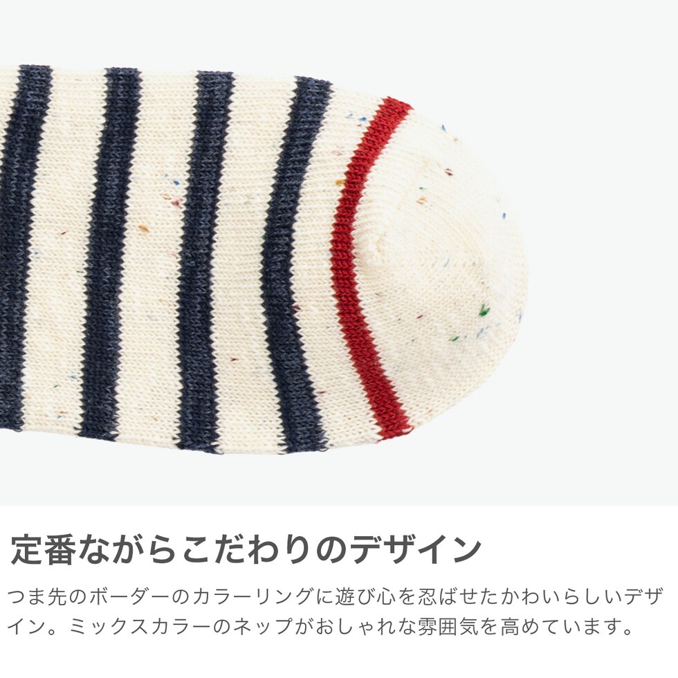 スニーカーソックス シンプルながら個性的なカラーネップを使用し、つま先の配色をアクセントにしたクラシカルなツートンボーダーのスニーカーソックス。かかとをやさしく包み、ズレにくいL字型の設計がポイント。独特な風合いと定番的なカラーリングで、カジュアルにもトラッドにも気軽に履ける1足です。 |