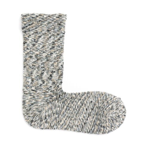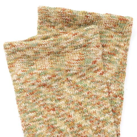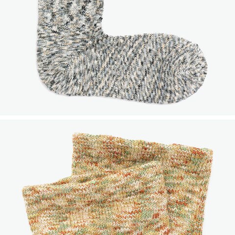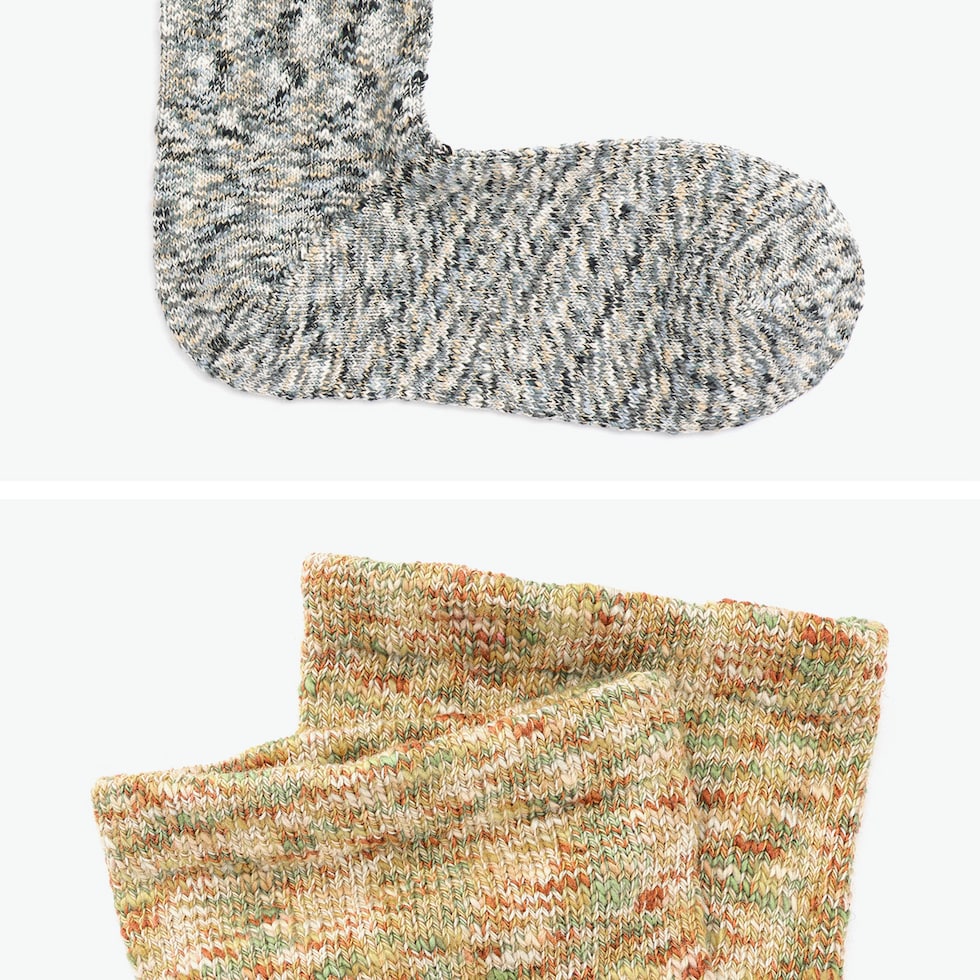 味わい深い表情の1足 別名『雲糸』と呼ばれる太番手のスラブ糸を絣染めにして編み立てたクルーソックス。絣染めにした太さの異なる色とりどりの糸の節がランダムに表面へ現れ、個性的で深みのある表情に。圧迫感が少なく、つま先まで快適なつくりです。 |