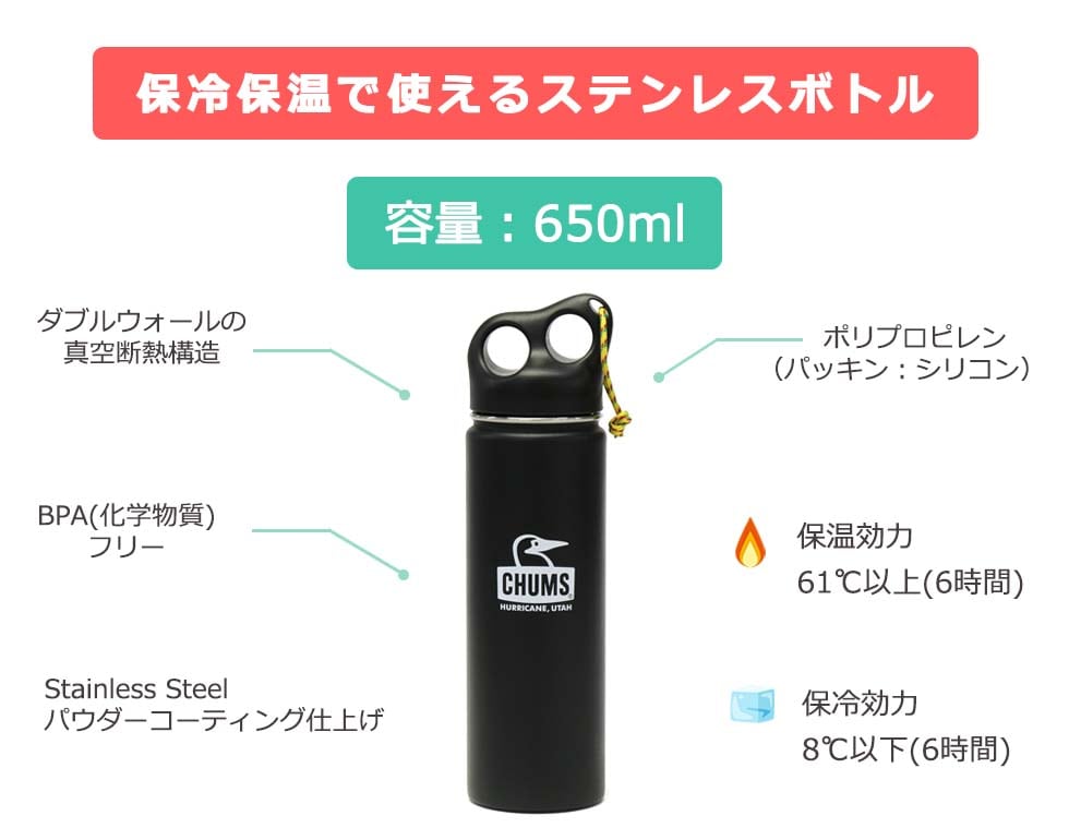 日本正規品 チャムス 水筒 CHUMS キャンパーステンレスボトル650 タンブラー 保温 保冷 蓋付き 真空断熱 ステンレス 大容量 魔法瓶 ボトル 650ml 通勤 通学 メンズ レディース CH62-1392