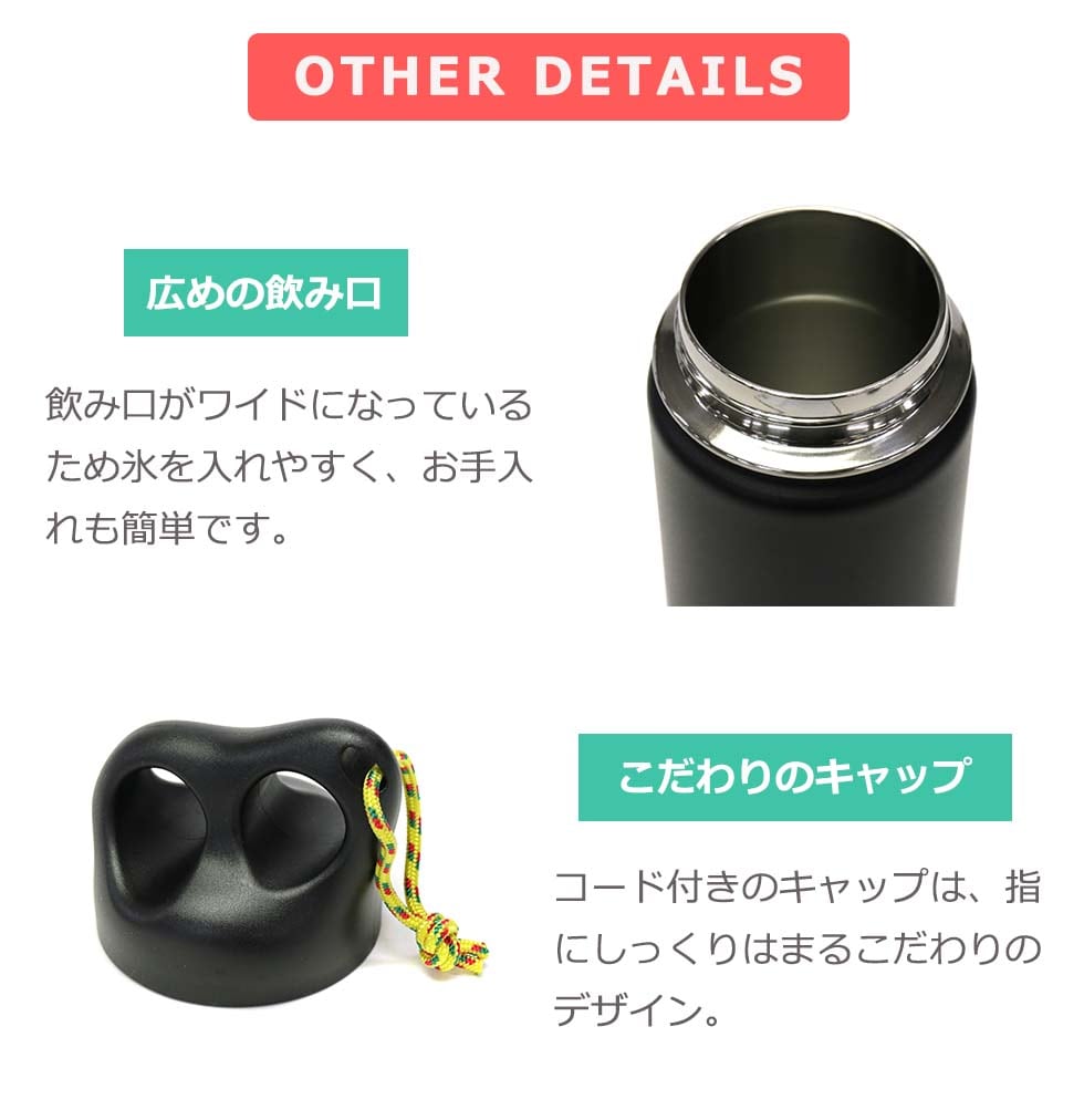日常使いをはじめ、スポーツ、アウトドア用にもお勧めの650mlサイズのステンレスボトル。ダブルウォールの真空断熱構造を採用し、温かい飲み物や冷たい飲み物を安全に持ち運べます。BPAフリーの為お子様のご使用にも安心。指にしっくりはまるデザインや、キャップにアウトドアコードが付いているのも魅力的。