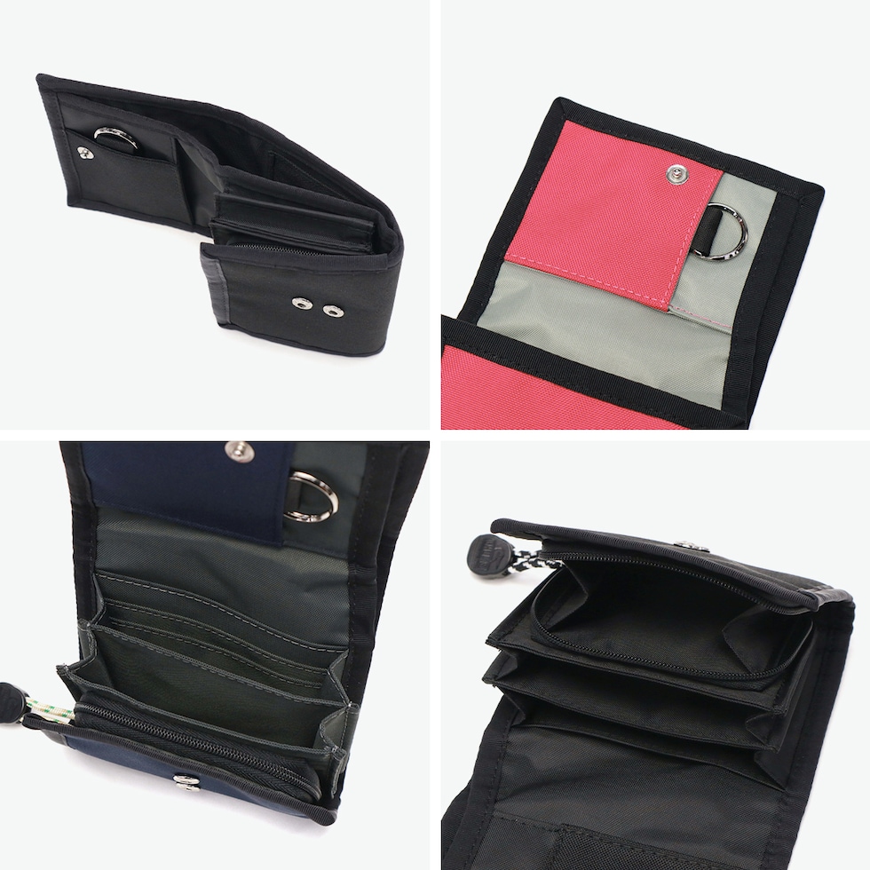 | 身軽に動きたい 旅行・アウトドアに◎ お財布、定期入れ、キーケースなど必需品をまとめて持ち運べる二つ折り財布。耐久性、機能性に優れているため、レジャーやアウトドアの専用財布としてもおすすめです。素材に残反(生地)を原料にしたリサイクルポリエステル「RENU(レニュー)」が採用され、環境に配慮したアイテムとなっています。 |