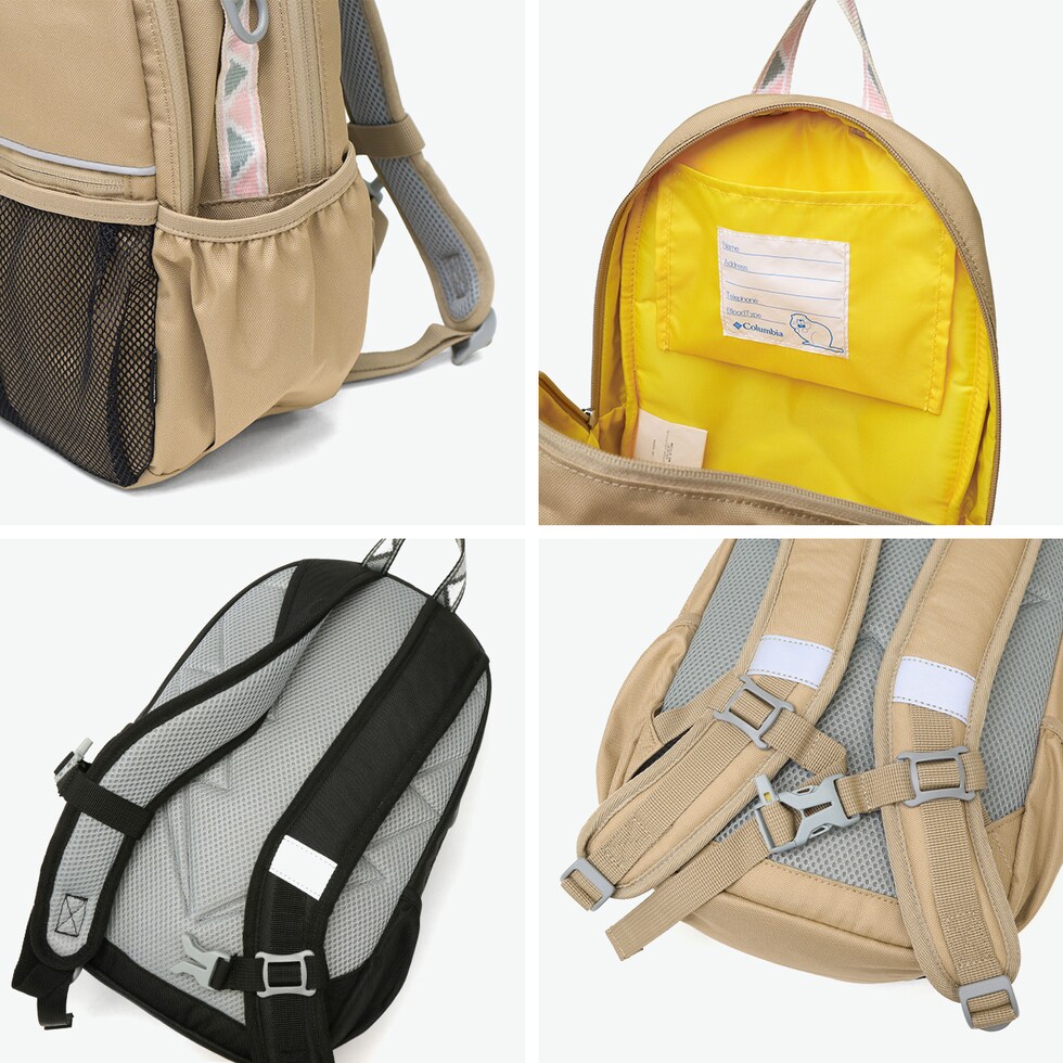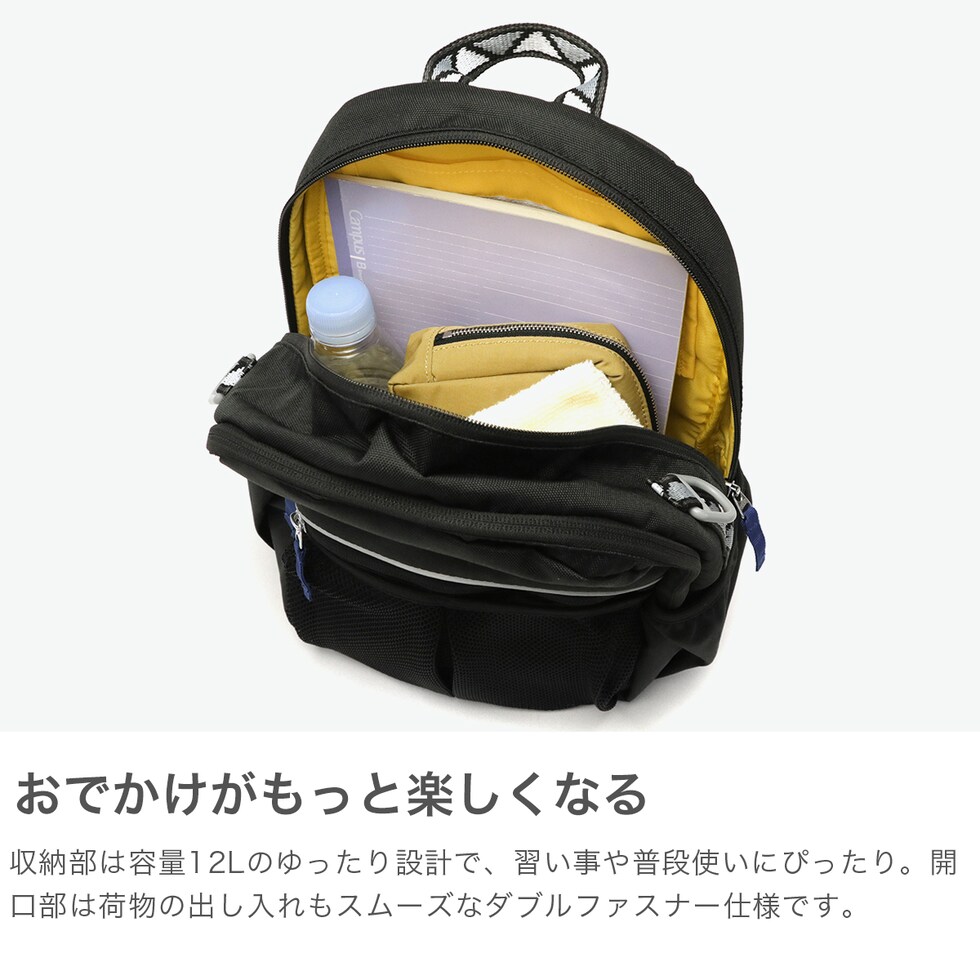 機能的なキッズリュック カジュアル感のあるジャガードテープがアクセントになった、容量12Lのキッズ用リュック。B5対応の内装は、ポケットを1つ備えたシンプルな設計で、荷物の出し入れがしやすいつくりです。撥水機能を持たせたほか、豊富なアウトポケット、ホイッスル付きのチェストストラップや、夜間も安心なリフレクターを装備するなど機能面も充実。イラストレーターの河野ルルさんとコラボした、キュートなラベルにも注目です。 |