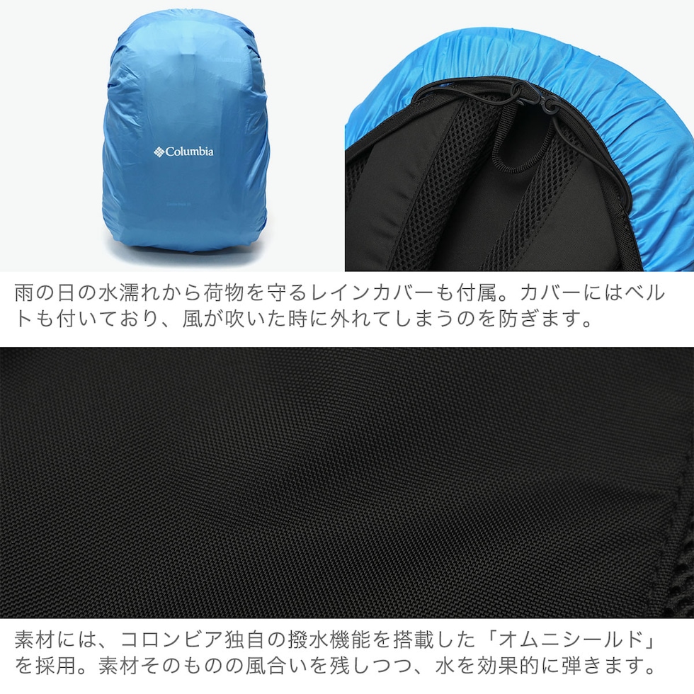| 悪天候にも負けない タフなバックパック 日帰りの登山やハイキングに最適な、コロンビア定番のバックパック。こちらはデイリーにも使いやすい20L容量です。本体には強度の高いナイロン素材に、ブランド独自開発の撥水機能『オムニシールド』を搭載し、天候を気にせず使える頼もしいリュックです。チェストストラップとウエストストラップ付きで安定感のある背負い心地を実現します。さらに、快適性をアップしたショルダーハーネスや付属のレインカバーなど、アクティブシーンに最適な仕上がりとなっています。 |