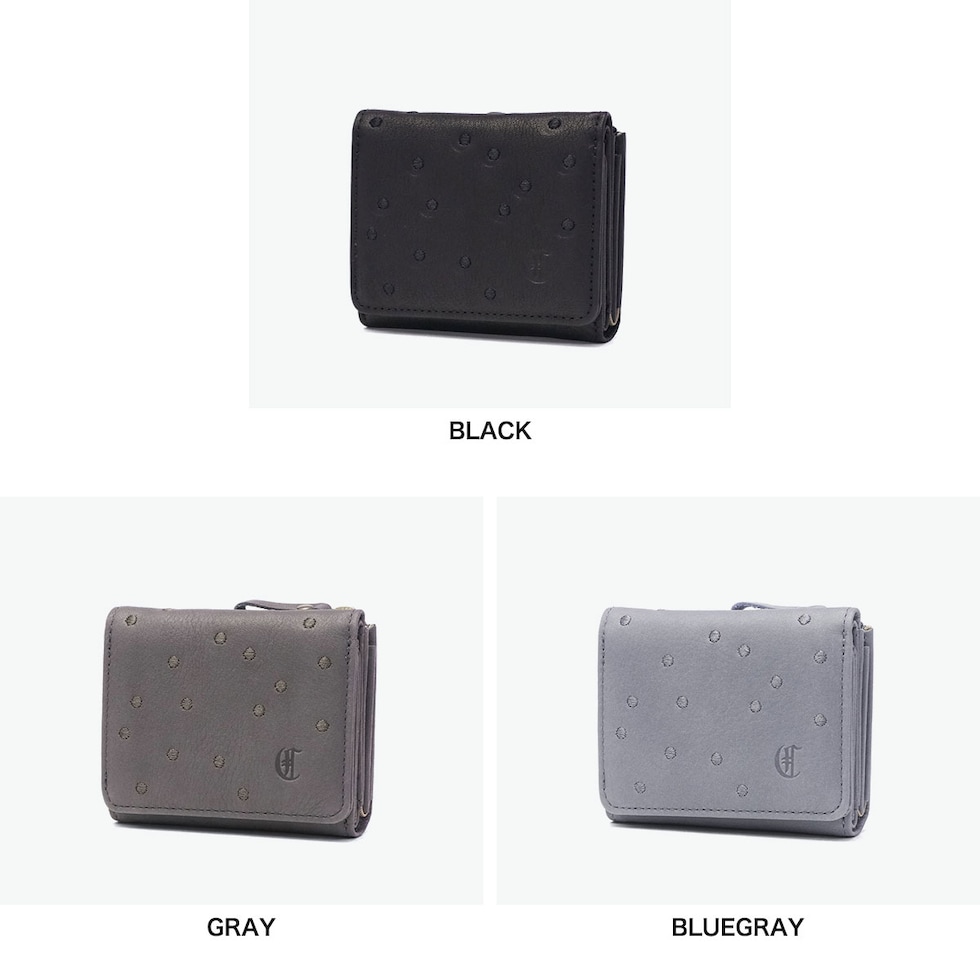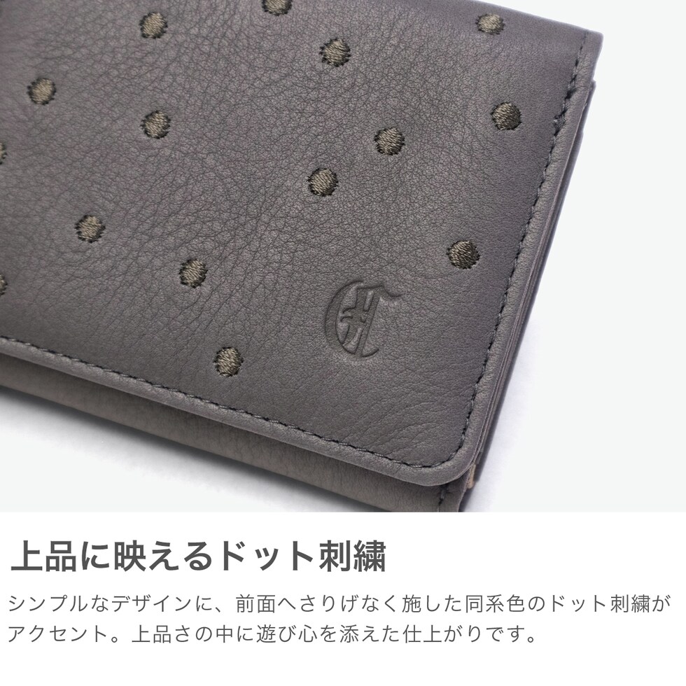 | 気取らない上品さ 洗練されたドット柄 ドット刺繍が上品に映えるコンパクトウォレット。前面へさりげなく施した同系色のドット刺繍がアクセントとなり、シンプルな中に遊び心を添えたようなアイテムに仕上がっています。手のひらサイズのコンパクト設計ながら、アイテムをしっかり収納できてスマートな使い心地。落ち着いたカラーリングが大人の余裕を演出してくれます。 |