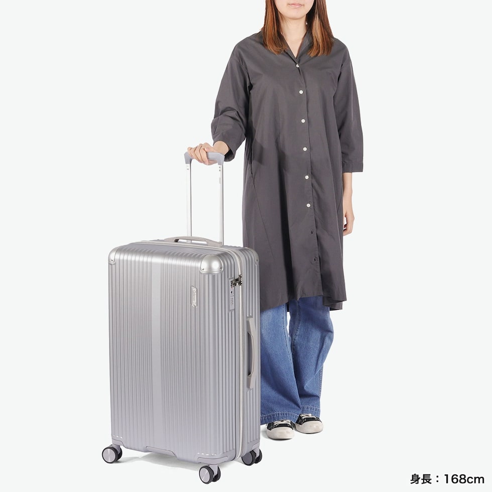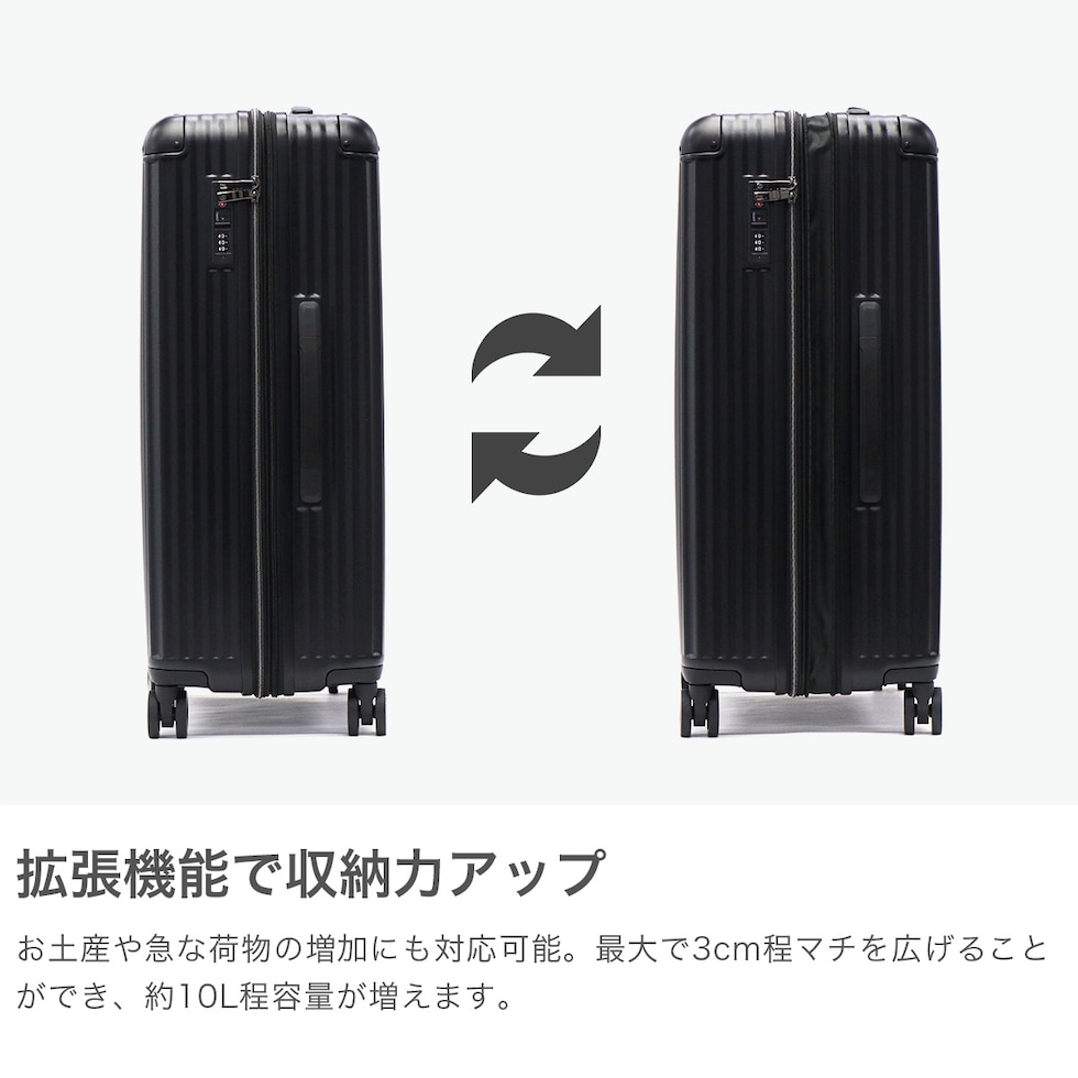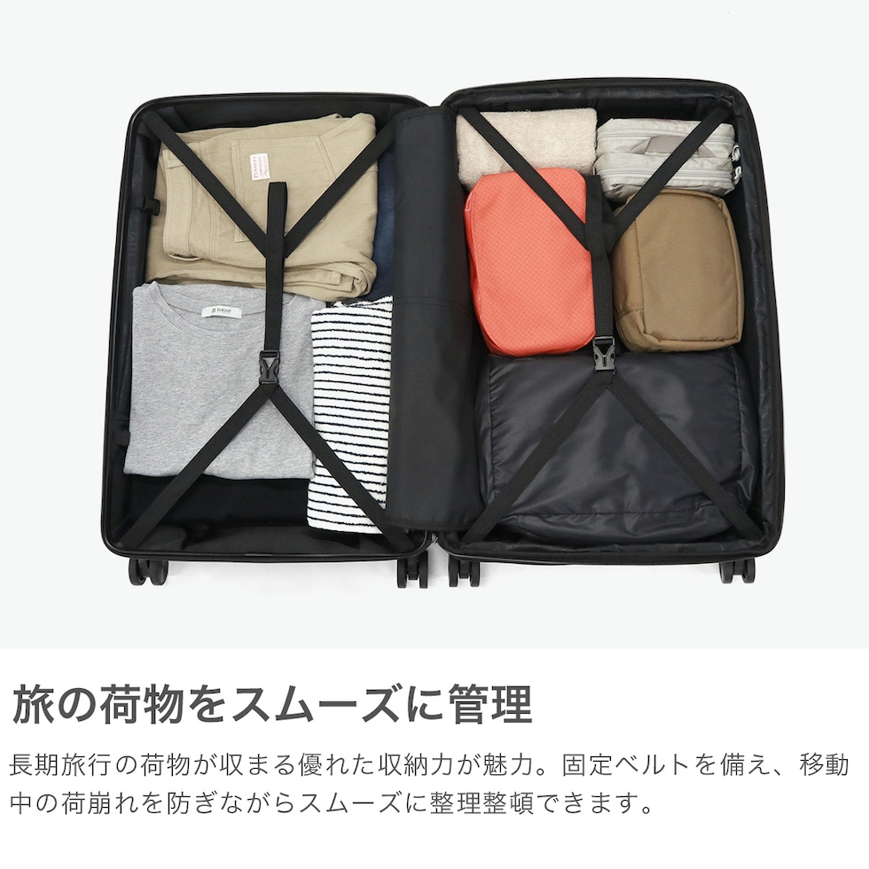 頼もしい仕上がり シンプルかつスタイリッシュなデザインが魅力の、エキスパンダブル機能付きスーツケース。固定ベルトやメッシュポケットで整理しやすく、伸縮ハンドルとダブルホイールで移動も快適に。衝撃に強いアルミ合金を細部に採用し、耐久性と密閉性にも優れた仕上がりになっています。 |