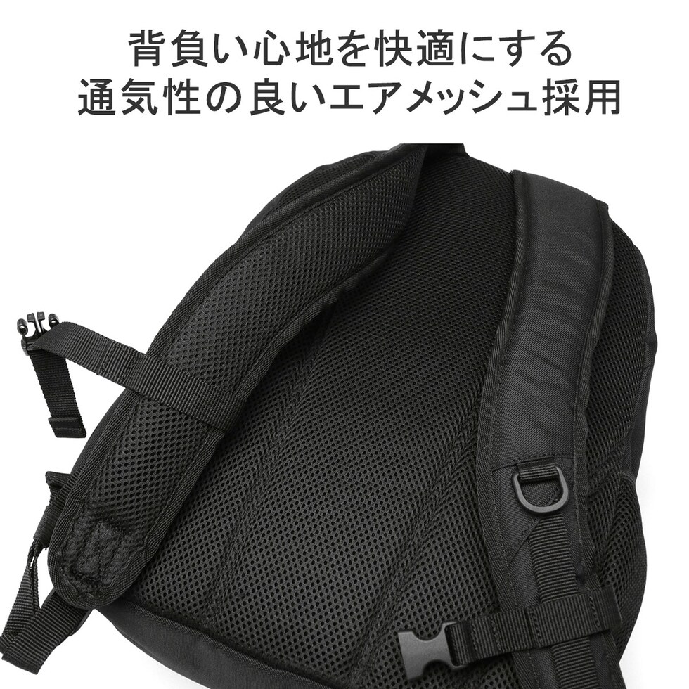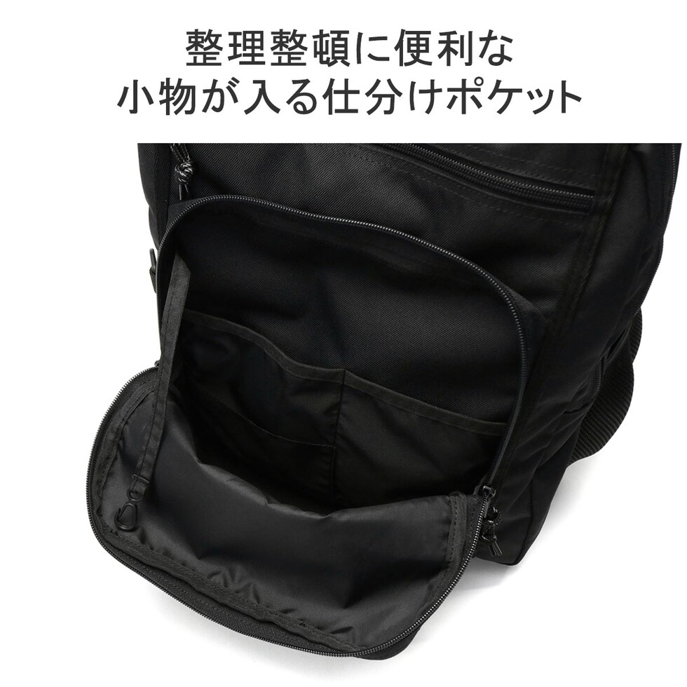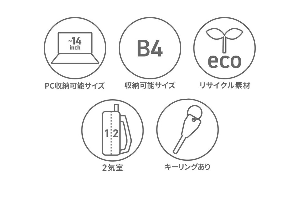 | 仕様 | <外側> ジップポケット(L)×1 ジップポケット(M)×1 └ 内蔵 ポケット(XS)×2 ポケット(XXS)×1 キーフック×1 ジップポケット(S)×1 メッシュポケット(S)×2 <背面収納> PC収納×1 |