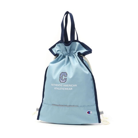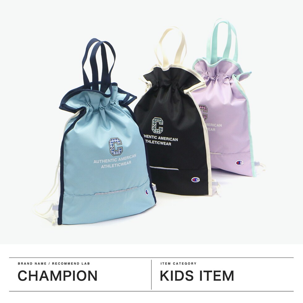 | ロゴがかわいい キッズ用ナップサック カジュアルシーンで人気な「Champion」の、お子様の通園・通学にオススメのナップサック。両端の紐を軽く操作するだけで開閉できる巾着タイプとなっており、小さなお子様が一人で使う場面でも安心。保育園、幼稚園のお着替えや、学校で使う体操着入れとしてはもちろん、上を絞らずトートバッグとしても使うことができます。 |