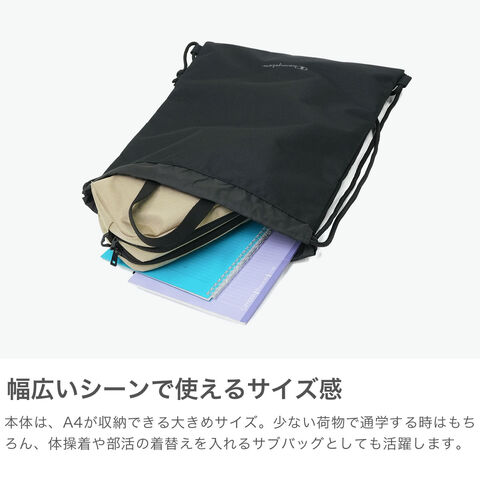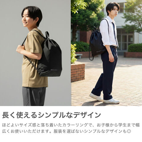 | 背負って楽々 毎日に寄り添う カジュアルシーンで人気のブランド『Champion/チャンピオン』のナップサック。体操着や着替えがすっきり入るA4対応サイズで、通学や部活、ジムやスポーツシーンでも活躍します。軽量で開閉しやすい巾着型に、手持ちできる短めのハンドル付き。制服にも私服にも合わせやすく、毎日のスクールシーンから普段使いまで幅広く活躍します。 |