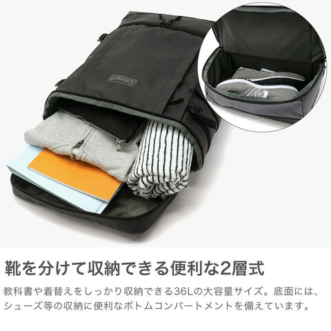 | 防水生地が魅力の 大容量バックパック アウトドアならではの耐久性と機能性を兼ね備え、通学やタウンユースにぴったりなシリーズ『SHIELD/シールド』。こちらは、シューズなどの収納に便利なボトムコンパートメントが備わった容量36Lのバックパックです。マチ幅のある人気のスクエアシルエットで、ファイルやノート、衣類などもたっぷりと収納可能です。雨の日も安心して使える防水生地を使用しているので、シーズンを問わず幅広いシーンで活躍してくれます。 |