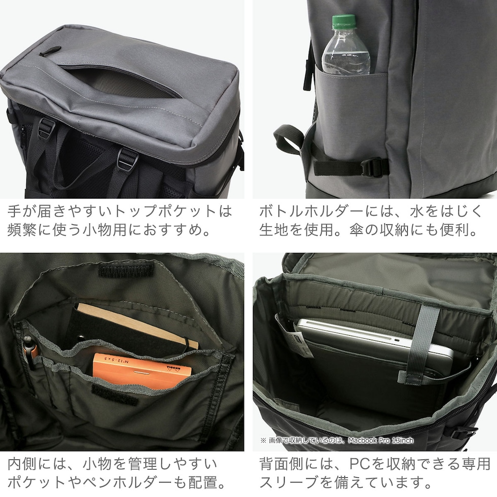 | 仕様 | <外側> ポケット×4 <内側> ポケット×2 PC収納×1 ペンホルダー×2 |