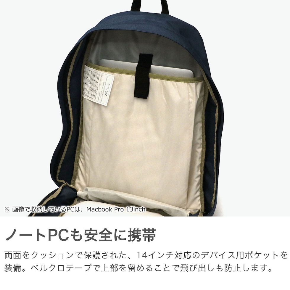 タフなつくりが魅力 荷物を仕分けて収納できる2層タイプのデイパック。斜めに開閉するフロントポケットがポイントなった、場面やコーデを選ばないシンプルなルックスが魅力です。本体には、摩擦や引き裂きに強いナイロン素材を採用。さらに耐久・撥水性に優れた“テフロン加工”を施すことで、雨の日も晴れの日もタフに使うことができます。 |