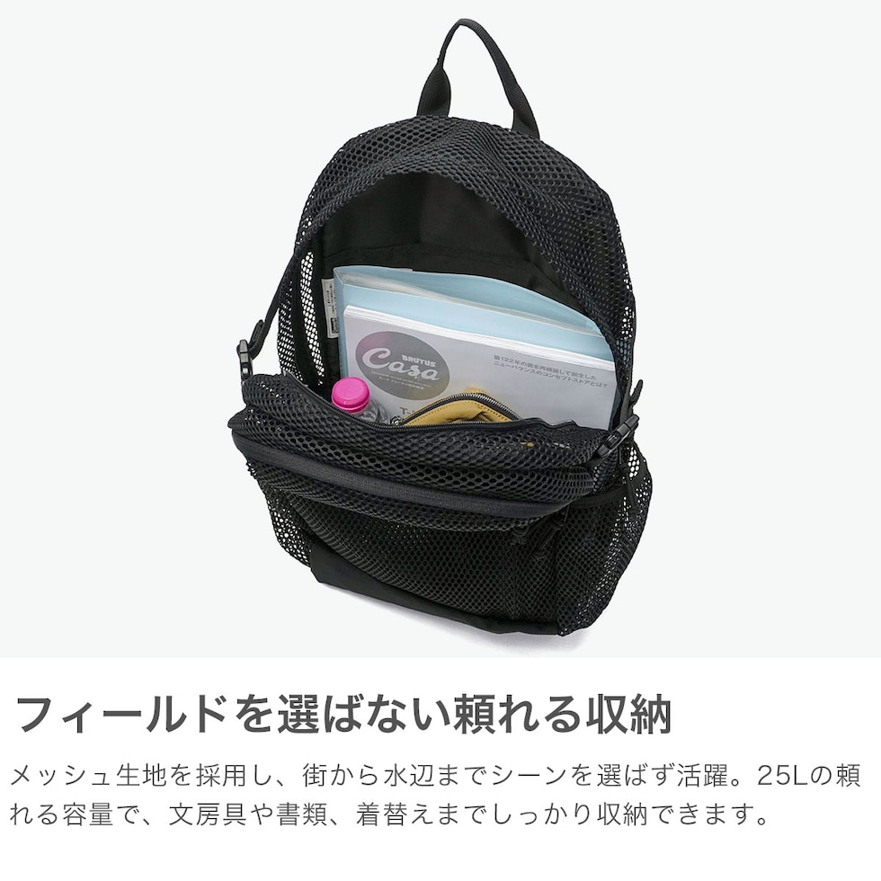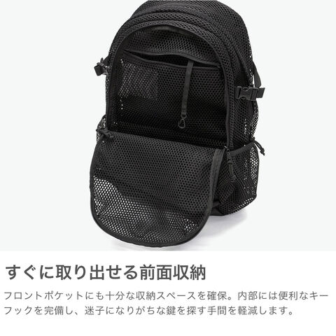| デザイン性と機能性が 背中で一つになる マルチユースなバッグシリーズ『WALKER/ウォーカー』のメッシュデザインが映える25Lリュックサック。A4サイズがすっきり収まるメインルームに加え、豊富なポケットで小物も整理しやすい設計。使わないウエストストラップは本体下部に収納できるのも嬉しいポイント。通勤、通学はもちろん、デイリーからアウトドアまで幅広く活躍します。 |
