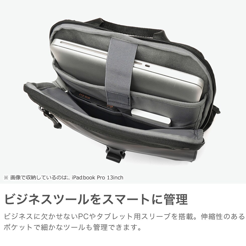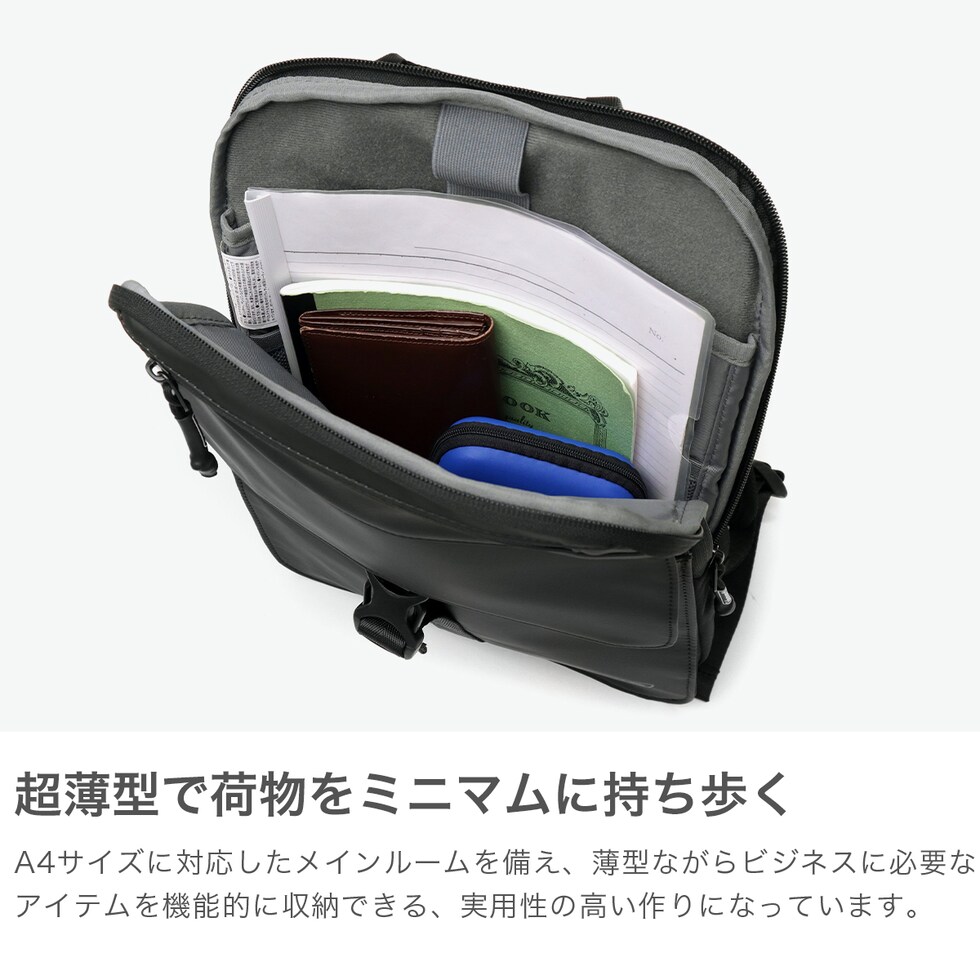 軽快ビジネスリュック スマートな薄型設計で、ビジネスシーンに最適なリュック。A4サイズや14インチPCが収納でき、通勤にも快適な5Lの容量を確保。スリムなフォルムなので、電車内や出張先の移動シーンでも邪魔にならず、都会的なスタイルにマッチするアイテムです。 |