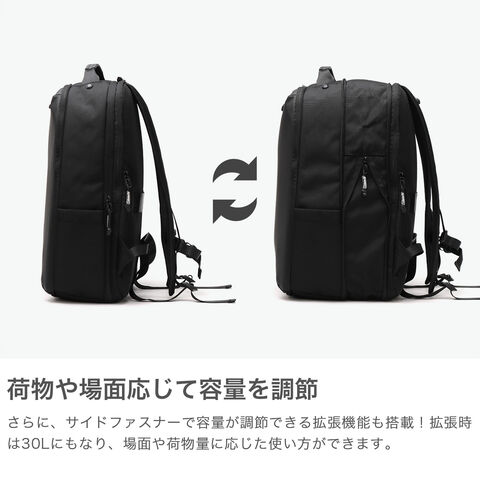 大容量通勤リュック 荷物の量に合わせて20Lから30Lへ拡張可能な大容量リュック。B4サイズや16インチPC、10インチタブレットが収納できる2層式デザインで、通勤・通学から出張・旅行まで幅広く対応。軽量で快適な背負い心地を実現し、キャリーオン機能も搭載。シンプルなデザインで男女問わず使いやすい万能モデルです。 |