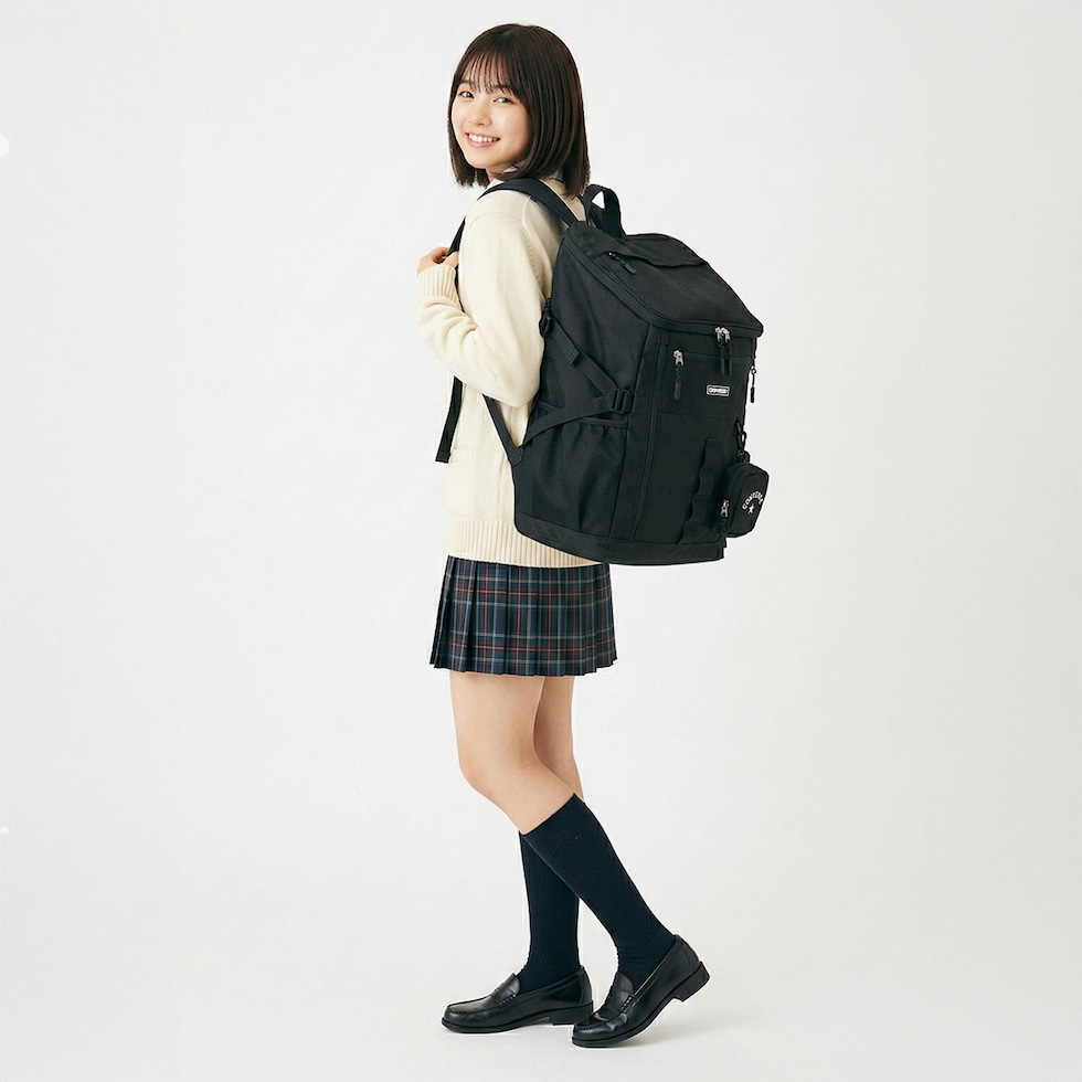 大容量バックパック 可愛さとかっこよさを併せ持つ、機能的で使い勝手抜群の大容量バックパック。A3サイズ対応のBOX型設計で、かさばりがちな通学荷物もすっきり整理して収納できます。ノートPC対応のクッション入りポケットやメインルーム内の仕切りなど、実用性も充実しつつも軽量で持ちやすく、通学から部活・通勤まで幅広いシーンに活躍。男女問わないデザインと、取り外し可能なミニポーチ付きで使い勝手の良さもポイントです。 |