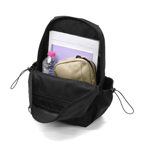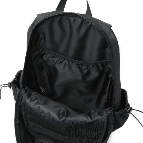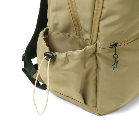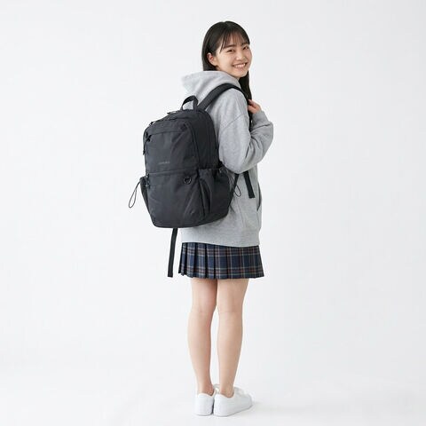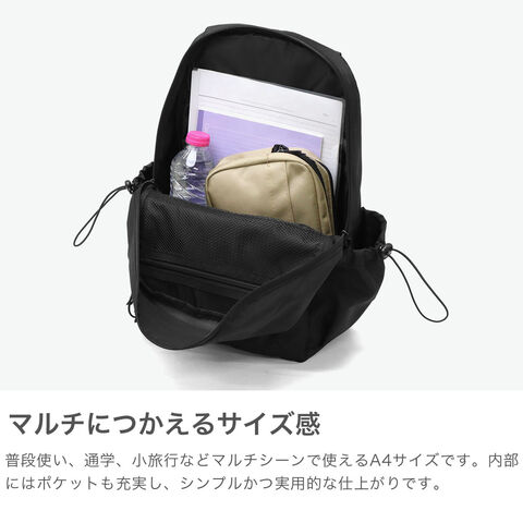 | 軽やかに背負える 万能リュックサック シーンや性別を問わず、マルチユースに活躍するリュック。シンプルで洗練されたデザインに、ブランドらしさを感じさせる星型のファスナー引手がさりげないアクセントになっています。メイン収納はA4サイズに対応し、書類やノートなどをすっきり収納できます。さらに両サイドには便利な巾着型ポケットを備え、日常使いに嬉しい機能性をプラスしました。軽量で扱いやすいポリエステル素材を採用し、長時間の持ち歩きも快適。学校や通勤はもちろん、レジャーや旅行など幅広く使えるコンパクトなバックパックです。 |