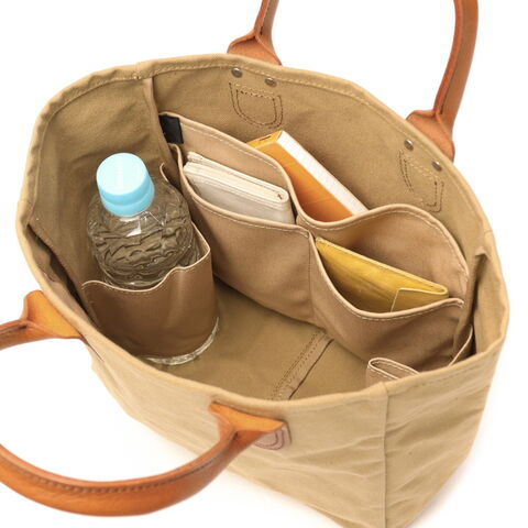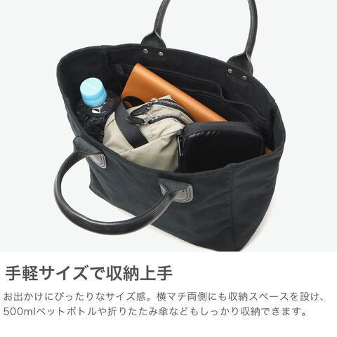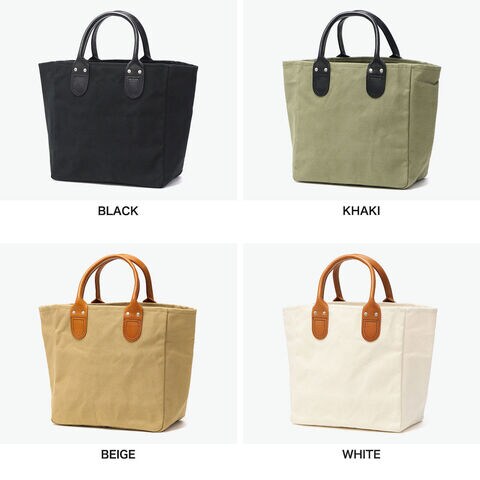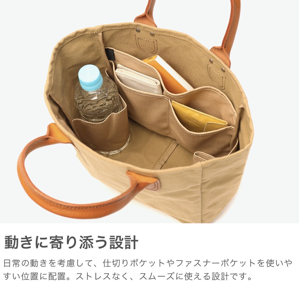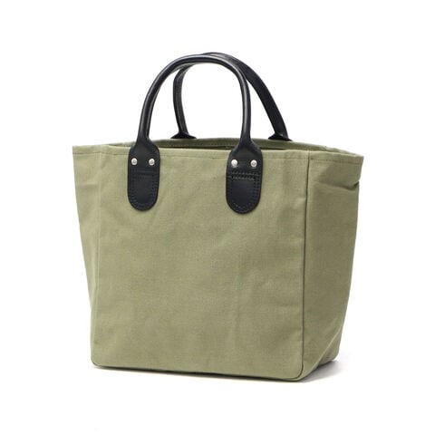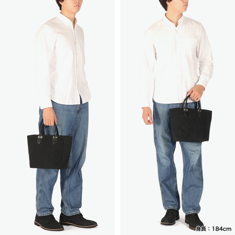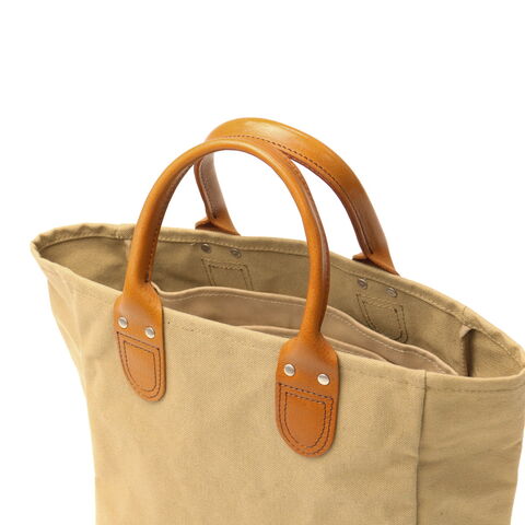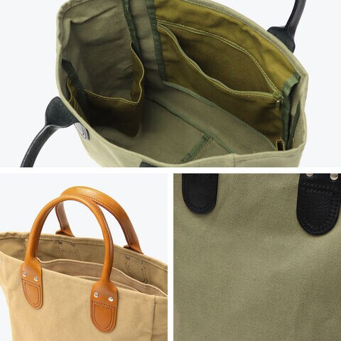 温もり感じるトート デニムや帆布の産地として有名な岡山県倉敷で仕立てた、普段使いしやすいSサイズのトートバッグ。通常の帆布に比べて多い本数の横糸で織られた生地は、しっかりと硬く締まった風合いが魅力です。ハンドルには、ソフトに鞣したヌメ革を採用し、割れにくく手にしっかりとなじむ仕上がりとなっています。 |