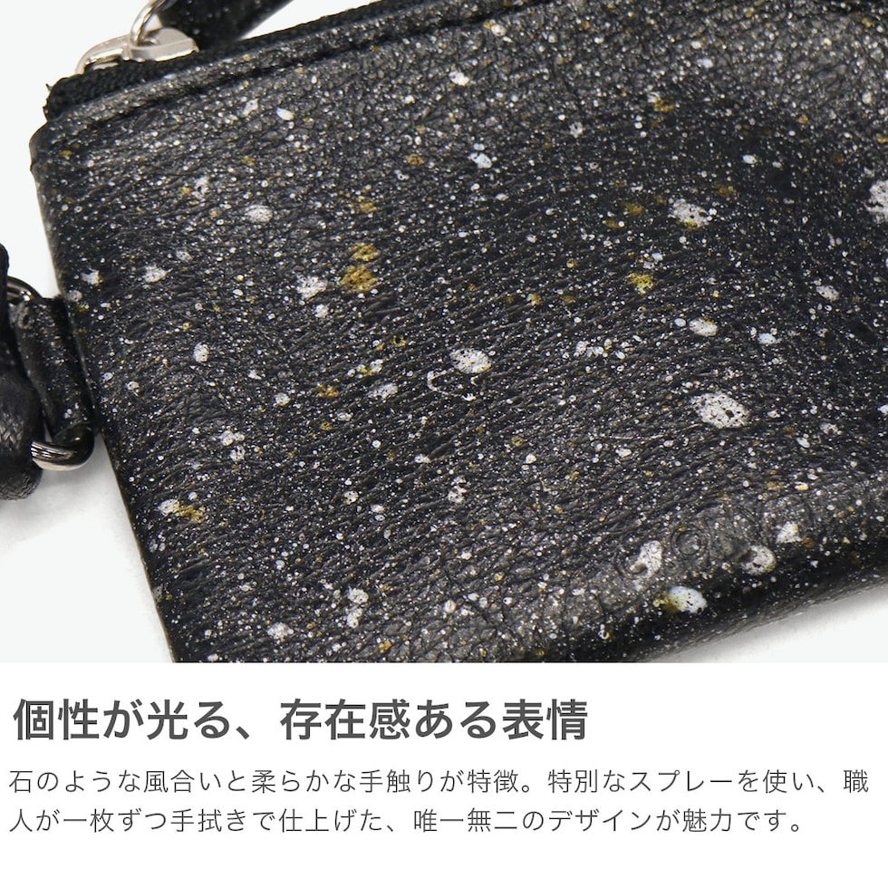 これ一つで身軽に外出 兵庫県の特産である本御影石を模したソフトレザーで仕立てた『MIKAGE』。「石のような見た目」と「手触りの良いソフトな風合い」が特徴です。こちらはカードがちょうどピッタリ収まり、首からかけられるようにストラップを付けたミニ財布。お財布を持つほどではない用事や、アウトドアシーンにもおすすめの手軽なサイズ感で、アクセサリー感覚でお使いいただけます。 |