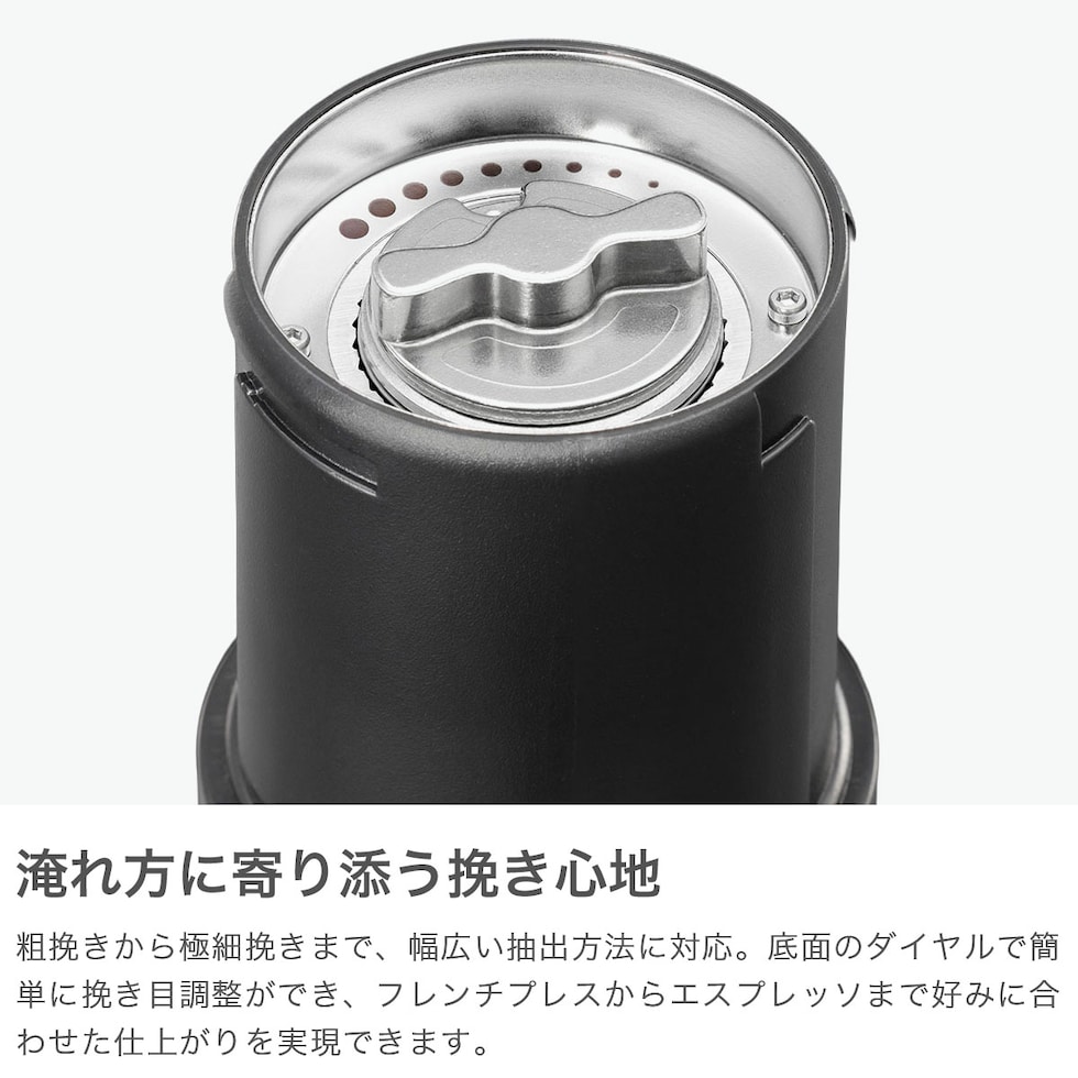 | 仕様 | <内蔵充電池> リチウムイオン電池7.4V/800mAh <充電用USBケーブル> 0.44m <連続使用回数> 約20~30回(※使用状況によって変動) <フル充電時間> 約2~3時間 <コーヒー豆容量> 25g <機能> 粒度調節 <付属品> 充電用USBケーブル、 掃除用ブラシ、ポーチ、取扱説明書(保証書含む) |