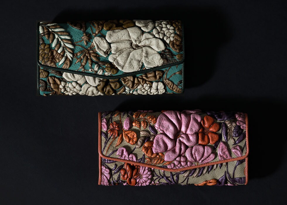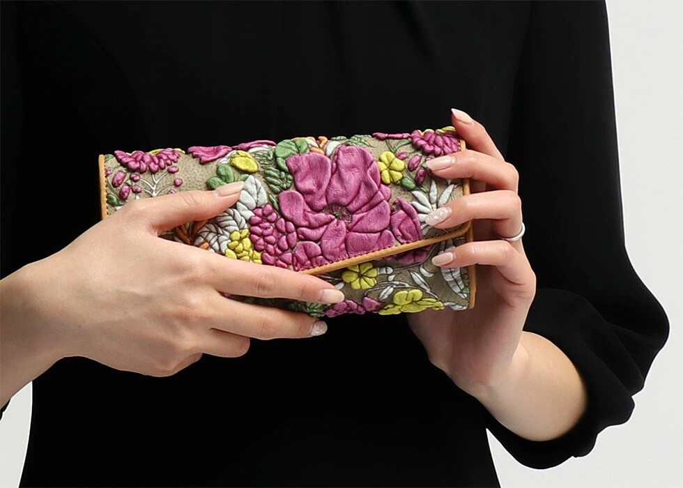 京都伝統の友禅技法と特殊加工で仕上げた立体模様の革を用い、熟練の職人により完成された『decobranche/デコブランシェ』の長財布。特徴的な立体模様はカラフルなカラーバリエーションがあり、持つだけでなく「見る」、「見せる」楽しみを与えてくれます。天然の革の質感ならではの、軽くてソフトな仕上がりも魅力です。見た目も使い心地もこだわりのアイテムとなっています。