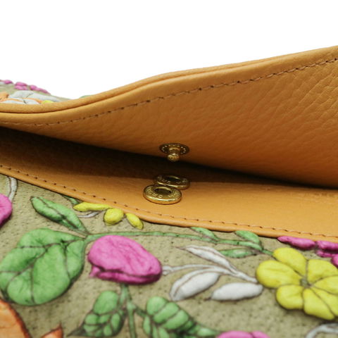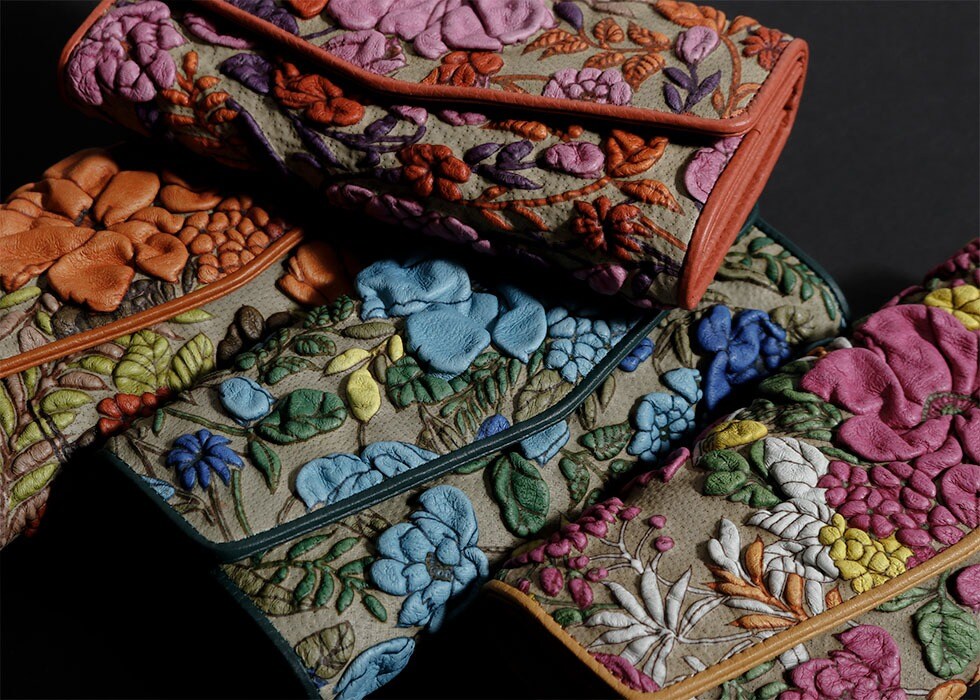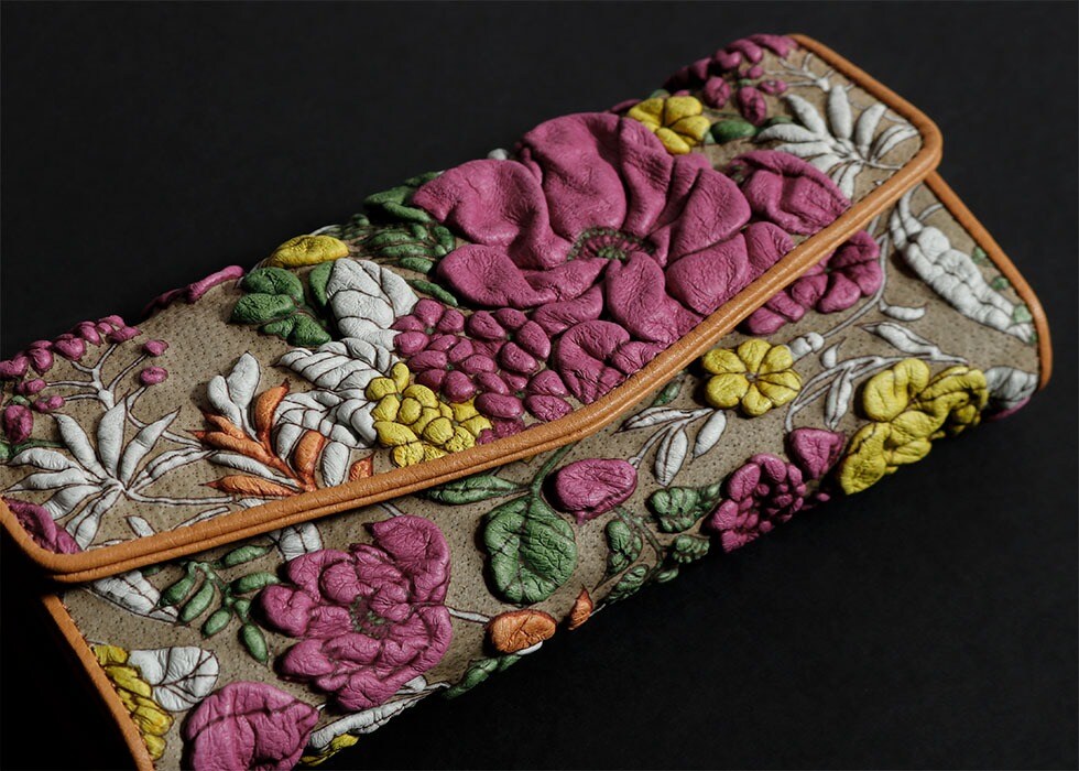 「KYOUKA」シリーズの革は友禅染めの技法を取り入れ、1色づつ染色をしています。さらに、独特な凸凹の花柄を作り出すために特殊加工を施し、1枚の革を1/3ぐらいまで縮ませており、通常の革製品よりも膨大な時間とコストがかけられています。また、1枚の革の場所によって、縮まり方や色の濃淡、柄の位置などに個体差があるため、お客様だけのオンリーワンの商品をお楽しみいただけます。