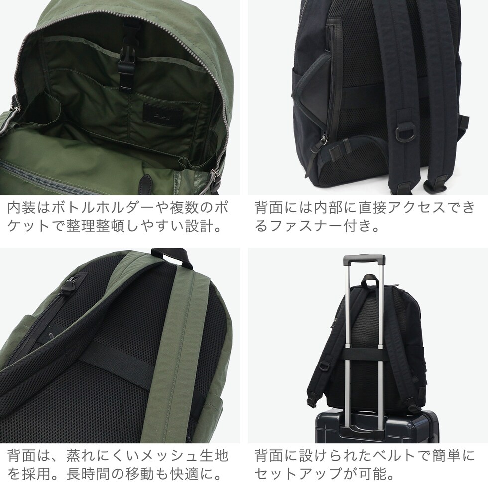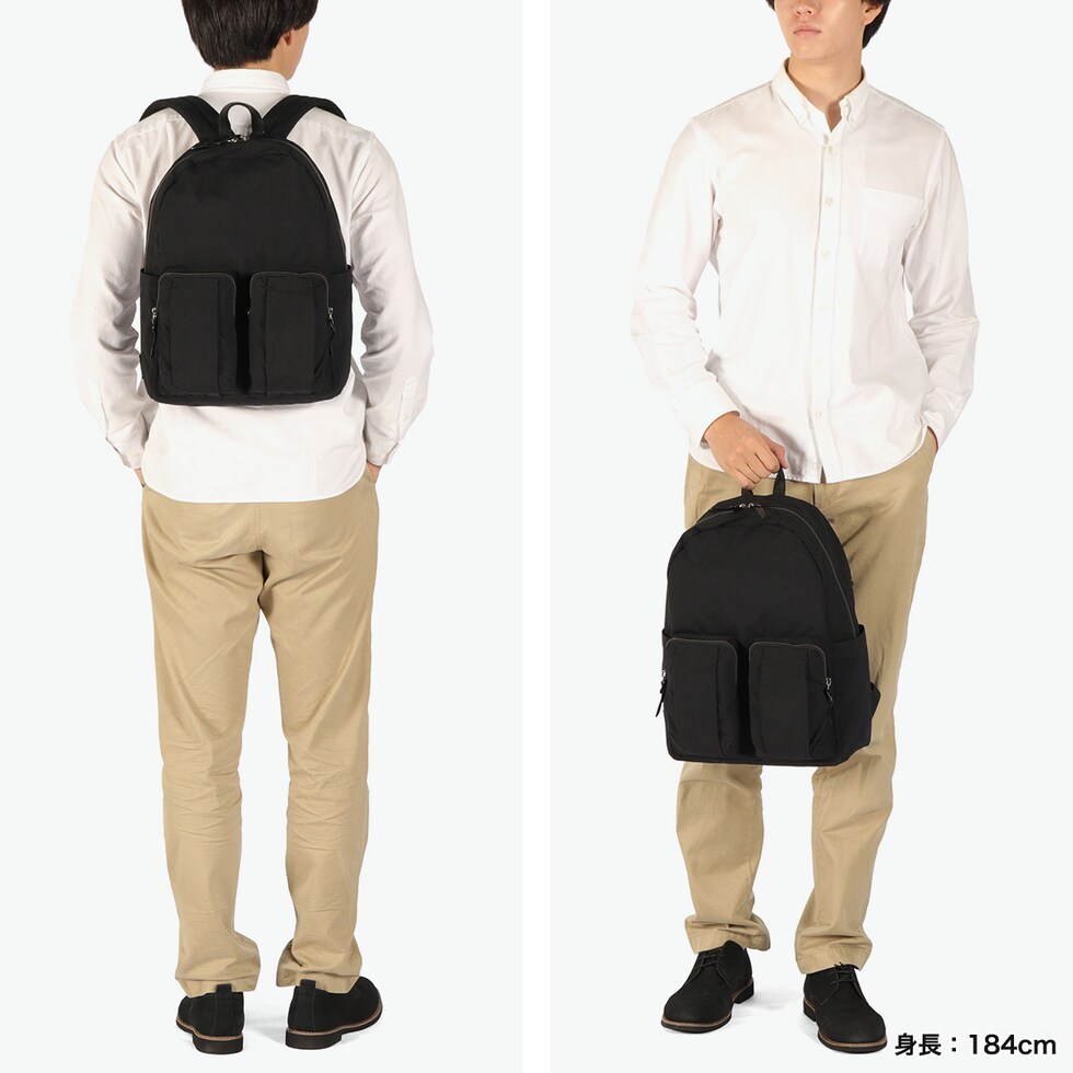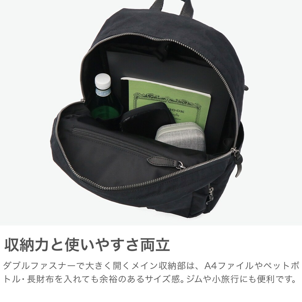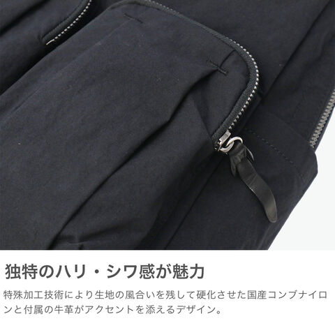 スタイルを格上げ 「軽さ」と「強度」を兼ね備えた異素材バッグシリーズ『ディグ』のリュック。独特のハリ・シワ感のあるコンブナイロンは、パリッとしたユニークな質感が魅力です。A4サイズも収納可能で、内外の豊富なポケットやボトルホルダーなど、優れた収納力がポイント。いつものカジュアルなスタイルをワンランクアップさせたい方におすすめのアイテムです。 |