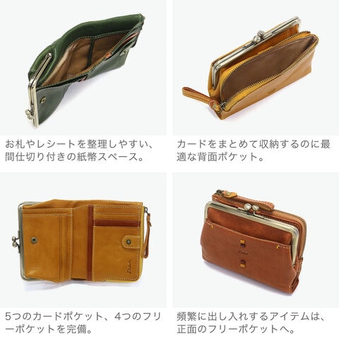 エイジングを楽しむ財布シリーズ『ペルリーネ』の二つ折り財布です。素材には、風合い・味わい深さ・表情の変化をお楽しみいただけるよう、良質なイタリアンレザーを使用。出し入れがしやすいがま口の小銭入れに加え、カード&フリーポケットを複数設置し、実用的な収納力も持ち合わせています。