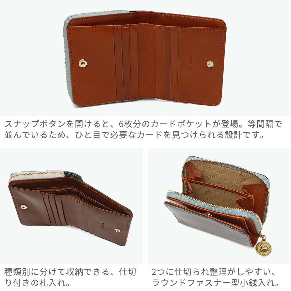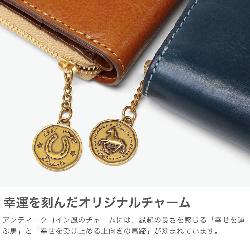 イタリア製のバケッタレザーを使用した、上質で長く使えるお財布シリーズ『ラフィナート』の二つ折り財布です。使うほどに手になじみ、レザー特有の風合いが楽しめます。内装にはブラウンやチョコカラーの牛革をあしらったコンビカラーが上品で、収納力と使いやすさも◎。また、アンティークコイン風のチャームには、ラッキーモチーフの馬と馬蹄が裏表でデザインされ、縁起の良さも感じることのできる特別なアイテムです。