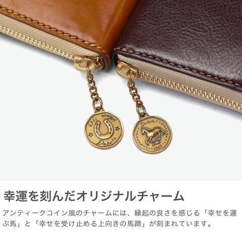 上品レザーウォレット イタリア製のバケッタレザーを使用した、上質で長く使えるお財布シリーズ『ラフィナート』。こちらは、カードポケット豊富なラウンドファスナー長財布。内装にはブラウンやチョコカラーの牛革をあしらうことで、外装とのコンビカラーが上品なアクセントに。また、ファスナーの引手はアンティークコイン風となっており、ラッキーモチーフの馬と馬蹄が裏表でデザインされ、縁起の良さも感じることのできる特別なアイテムです。 |