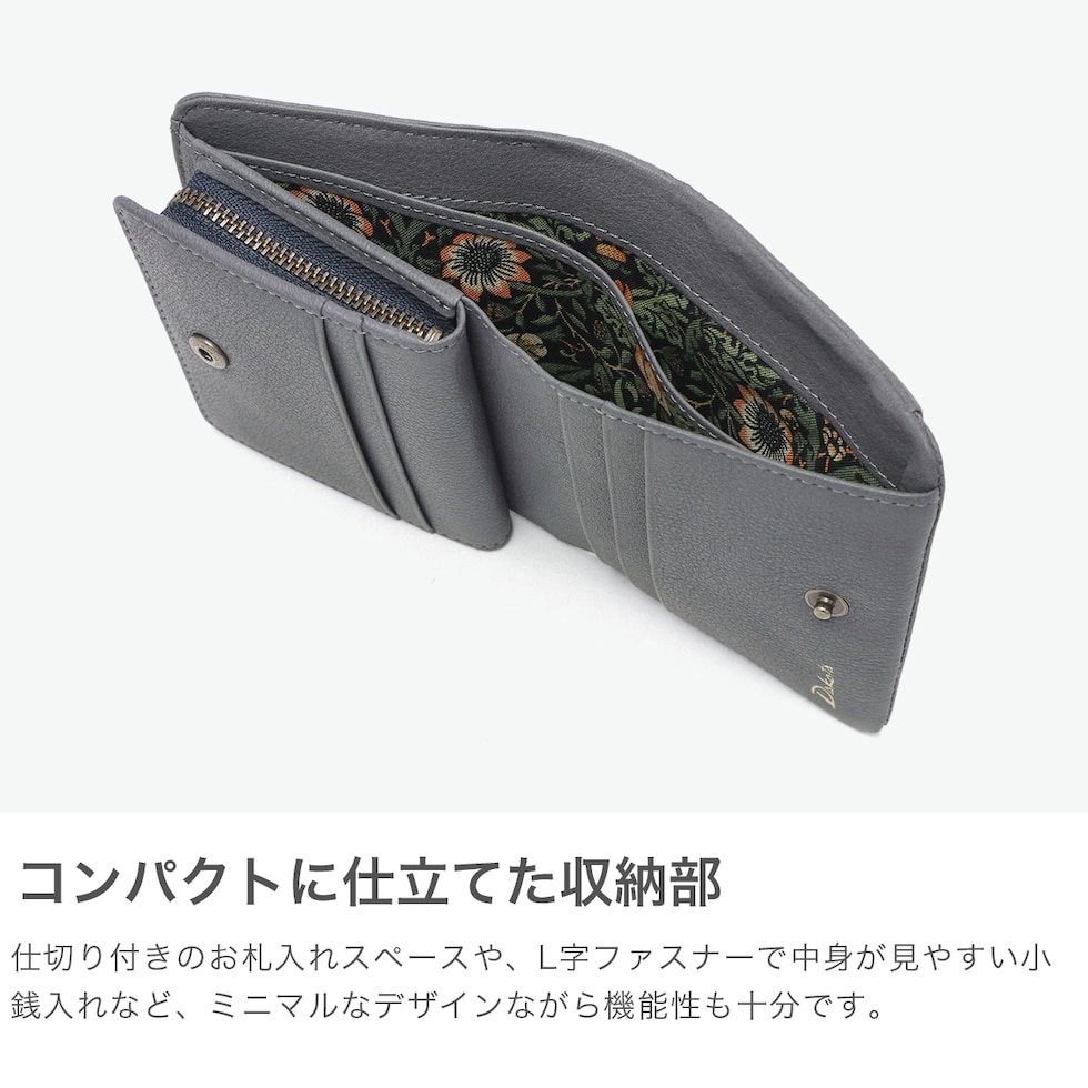 | 上品な素材使いが魅力 コンパクトな折り財布 「BEST OF MORRIS」の生地を内装に使用した『バイブリー』シリーズの二つ折り財布です。内装には時代を超えて愛される芸術的なテキスタイルが広がり、カラーごとに異なる内装パターンが魅力です。軽く柔らかな牛革を袋縫いでふっくらと仕上げ、優しく上品な印象に。繊細な馬蹄モチーフのブローチが革の美しさを引き立て、日常を華やかに彩ります。 |