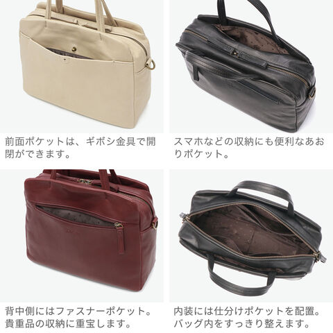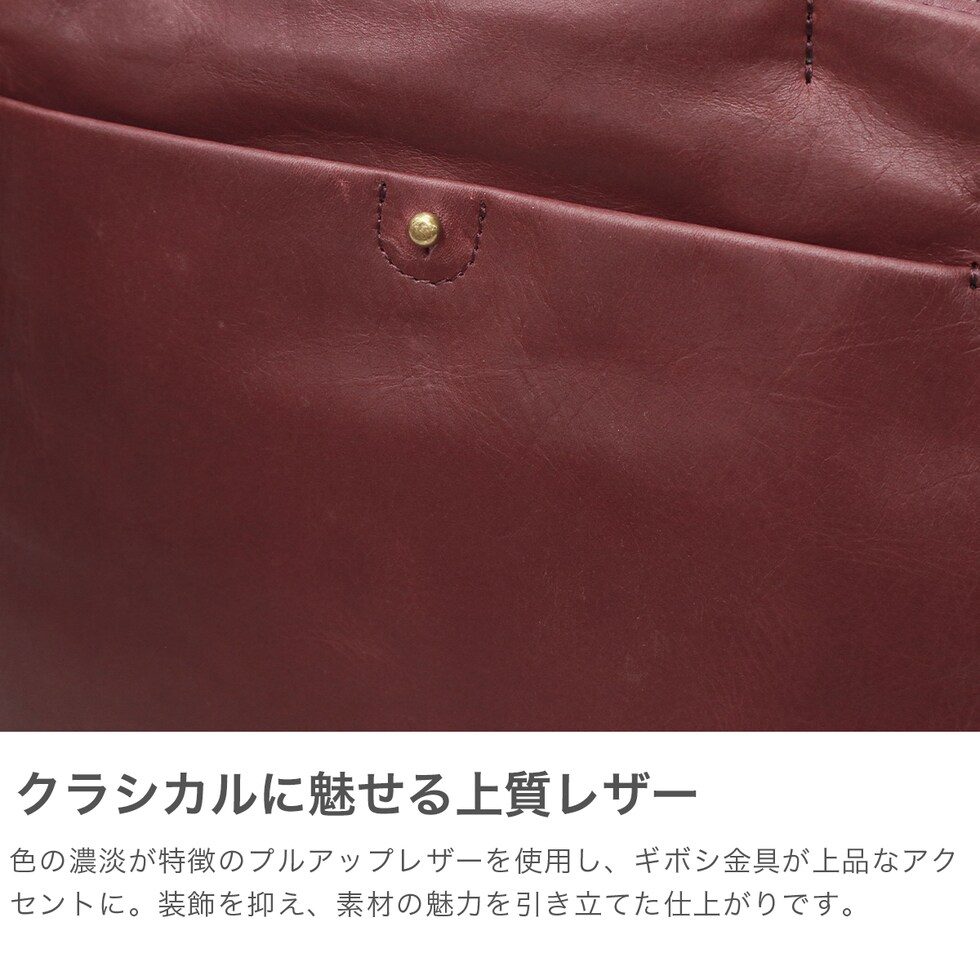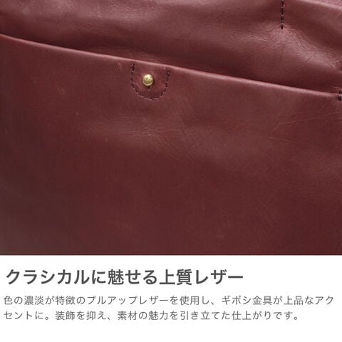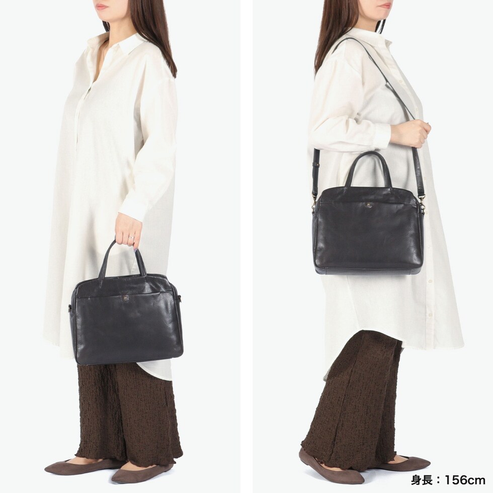 | レザーの表情が魅力の シンプル2WAYバッグ ラウンドフォルムとビンテージ調の風合いが魅力の『ネロ』シリーズの2WAYバッグです。B5サイズが収まるサイズ感で、大きすぎずに程よい存在感。プルアップレザーならではの美しい濃淡が、落ち着きのある上品さを引き立てます。フロントのギボシ金具がクラシカルな印象をプラス。装飾を控えたシンプルなデザインが、素材の魅力を一層引き立て、大人の装いにさりげなく寄り添います。 |