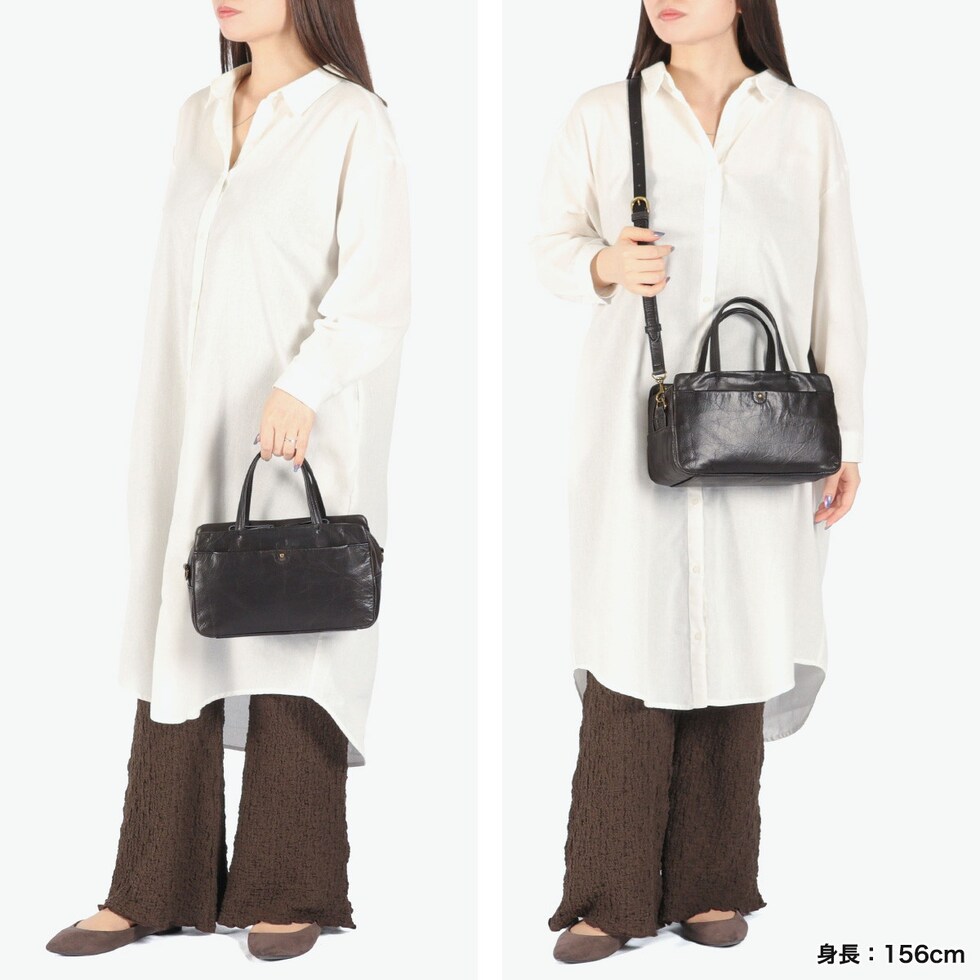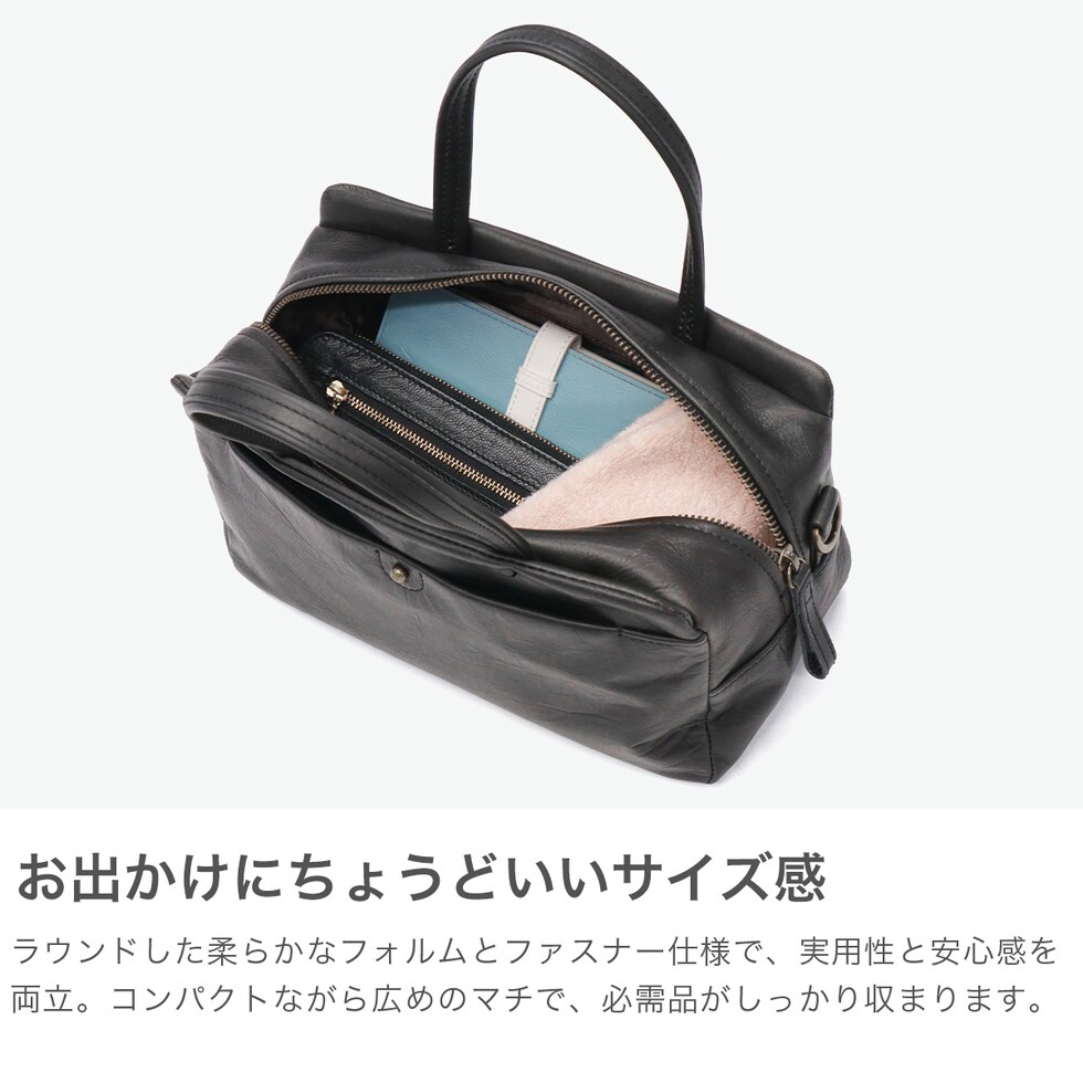 ラウンドフォルムとビンテージ調の風合いが魅力の『ネロ』シリーズの2WAYバッグです。コンパクトながら、マチがしっかりあるので500mlのペットボトルなど必要なものがしっかり収まるサイズ感。プルアップレザーならではの美しい濃淡が、落ち着きのある上品さを引き立てます。フロントのギボシ金具がクラシカルな印象をプラス。装飾を控えたシンプルなデザインが、素材の魅力を一層引き立て、大人の装いにさりげなく寄り添います。