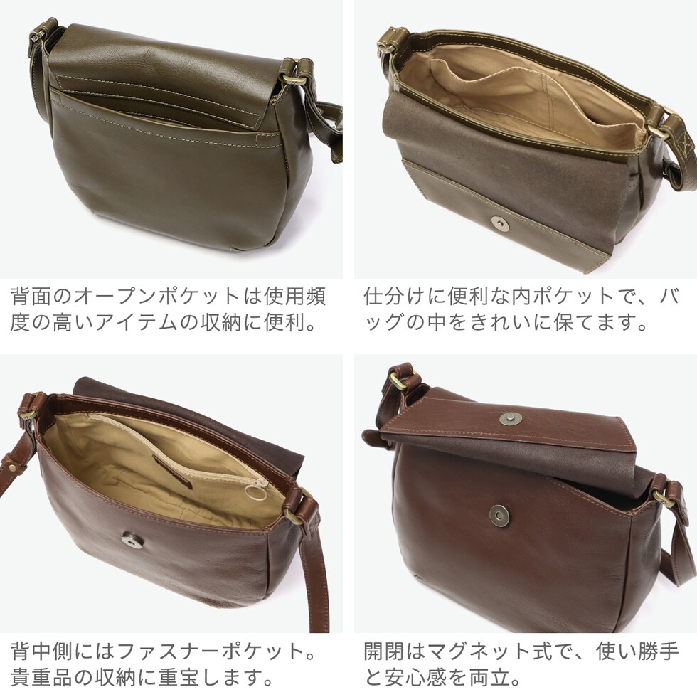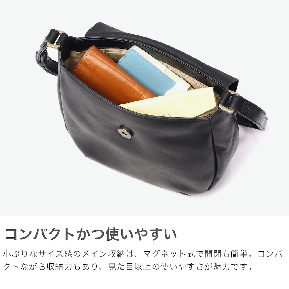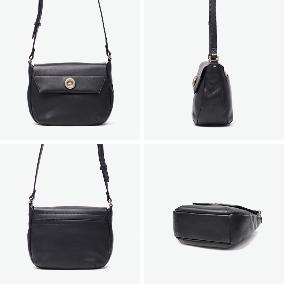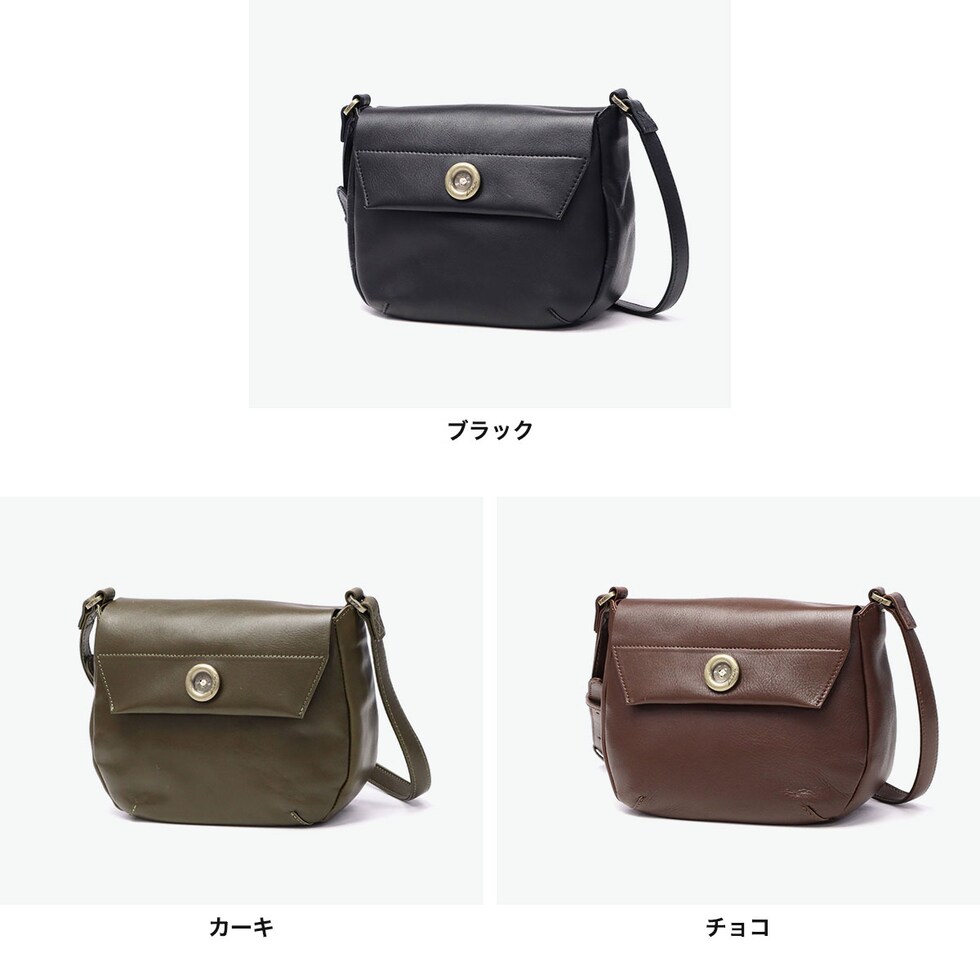| 上質レザーが放つ シックな佇まい シックなレザーにアンティーク調ボタンが映える、『ボットーネ』シリーズのショルダーバッグです。フラップと丸みのあるフォルムが上品な可愛らしさを演出します。コンパクトながら収納力があり、ショルダーストラップは長さ調節可能で、持ち方次第で印象チェンジも楽しめる、大人のためのアイテムです。 |