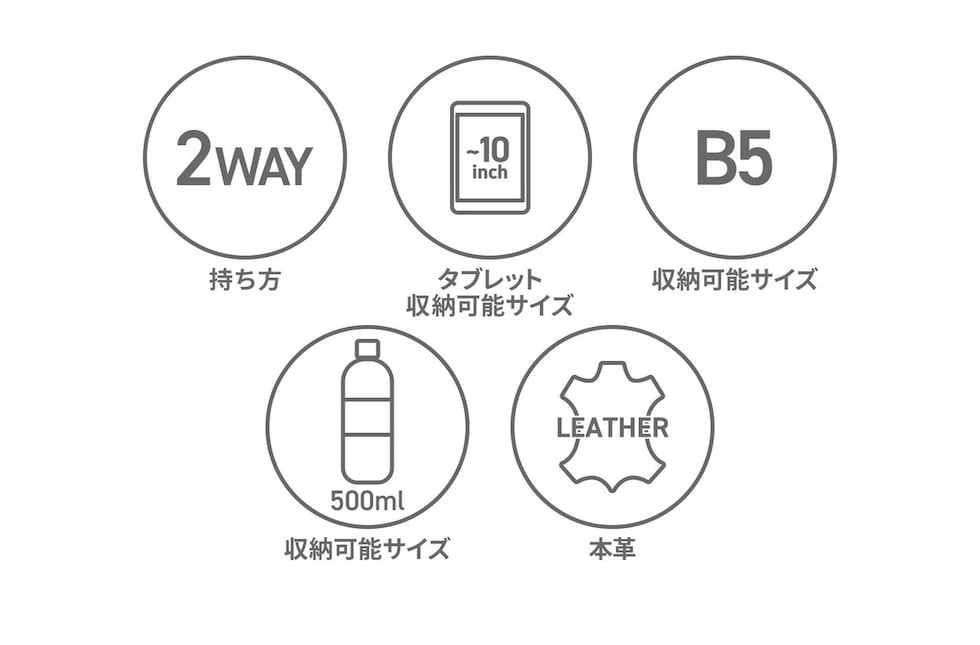 | 仕様 | <外側> ジップポケット(L)×1 └ 内蔵 ポケット(M)×1 ジップポケット(M)×2 <内側> タブレット収納×1 <付属品> ショルダーストラップ×2 |