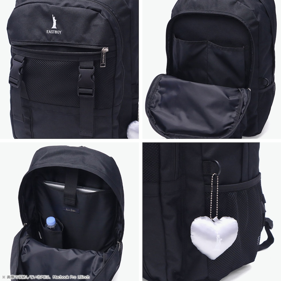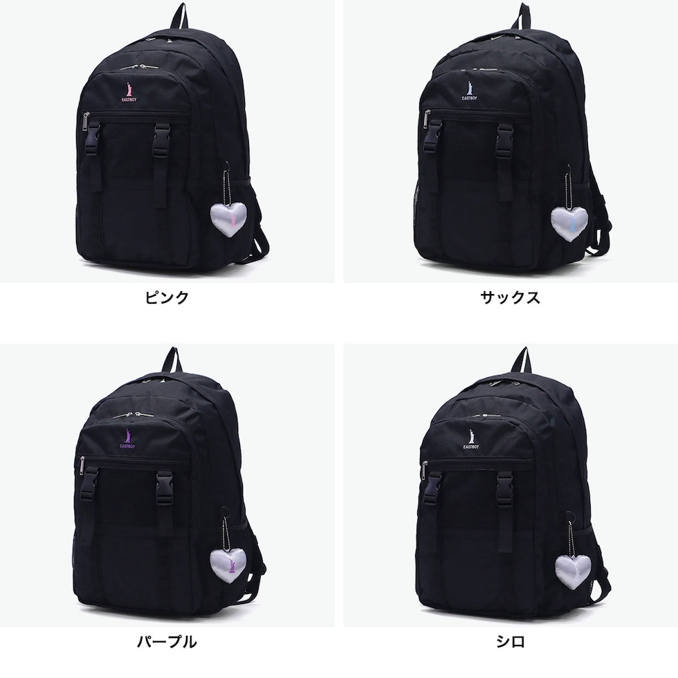 シルバーのハートのぬいぐるみチャームがアクセントになった女子高生の“かわいい”を追求したシリーズ「サニー」。荷物の学生におすすめの32L容量のリュックサック。軽量かつ高強度なポリエステル素材に撥水加工を施し、毎日使いでも安心のタフなつくり。B4サイズが収まり、PC収納も完備した機能的な仕様で学校生活をサポート。デザインの特徴でもあるバックルは、ジャケットを挟んだりチャームを付けることもでき多用途で活躍してくれます。