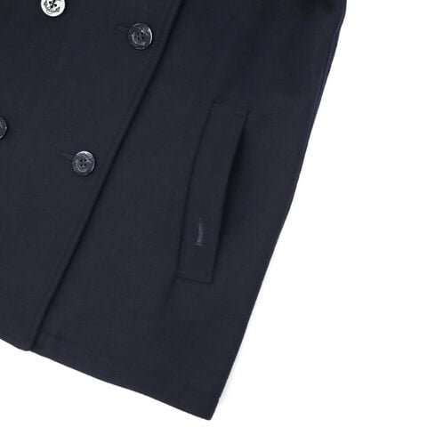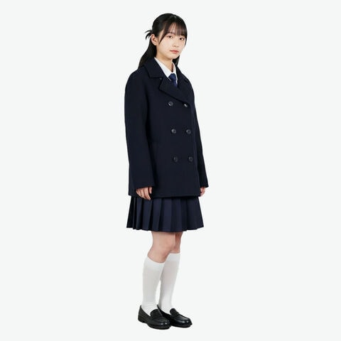 冬の定番Pコート 人気の定番デザインのPコート。保温性に優れたウール混メルトン素材を使用し、寒い季節もあたたかく快適に。左右どちらを前にしても着られる本格仕様で、制服の上からでもきれいに着こなせるシルエットが魅力です。オリジナル仕様のボタンとポケット口の女神刺繍がポイントの、通学にぴったりな一着です。 |