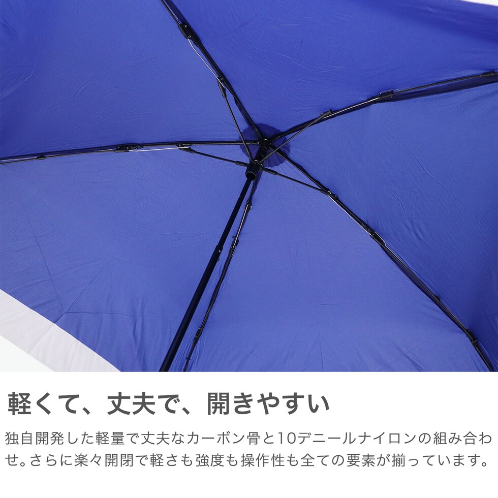 魔法のような軽さを実現 軽さと強度を兼ね備えたカーボンフレームを1から再構築し、スマホより軽く重さを感じさせない「魔法のような軽さ」を叶えた折り畳み傘。ただ軽いだけでなく楽々開閉で操作性にも自信あり。カバンの中でも場所をとらないスリムなボディで毎日の持ち歩きに負担にならないので、365日持ち歩く常備傘に最適です。 |