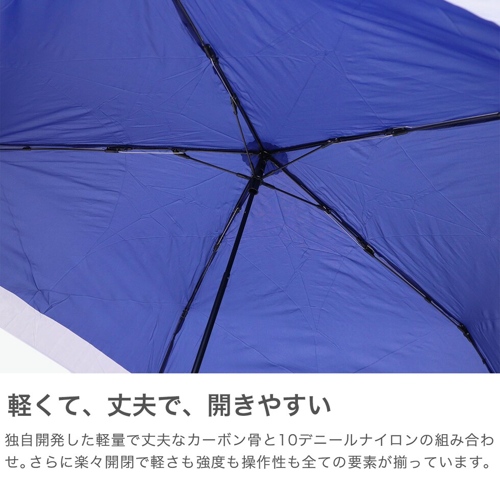 魔法のような軽さと強度 軽さと強度を兼ね備えたカーボンフレームを1から再構築し、スマホより軽く重さを感じさせない「魔法のような軽さ」を叶えた折り畳み傘。ただ軽いだけでなく楽々開閉で操作性にも自信あり。紫外線防止加工を施しており、雨の日のUV対策にもおすすめです。 |