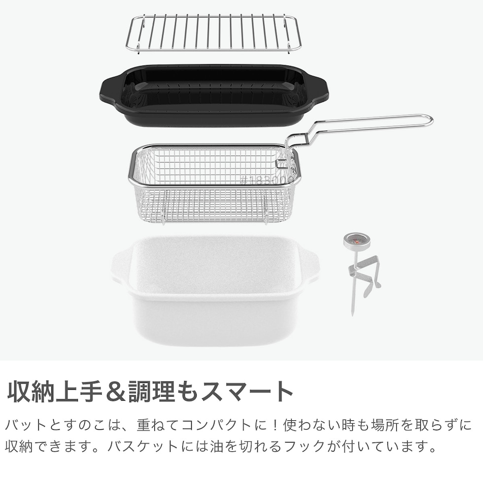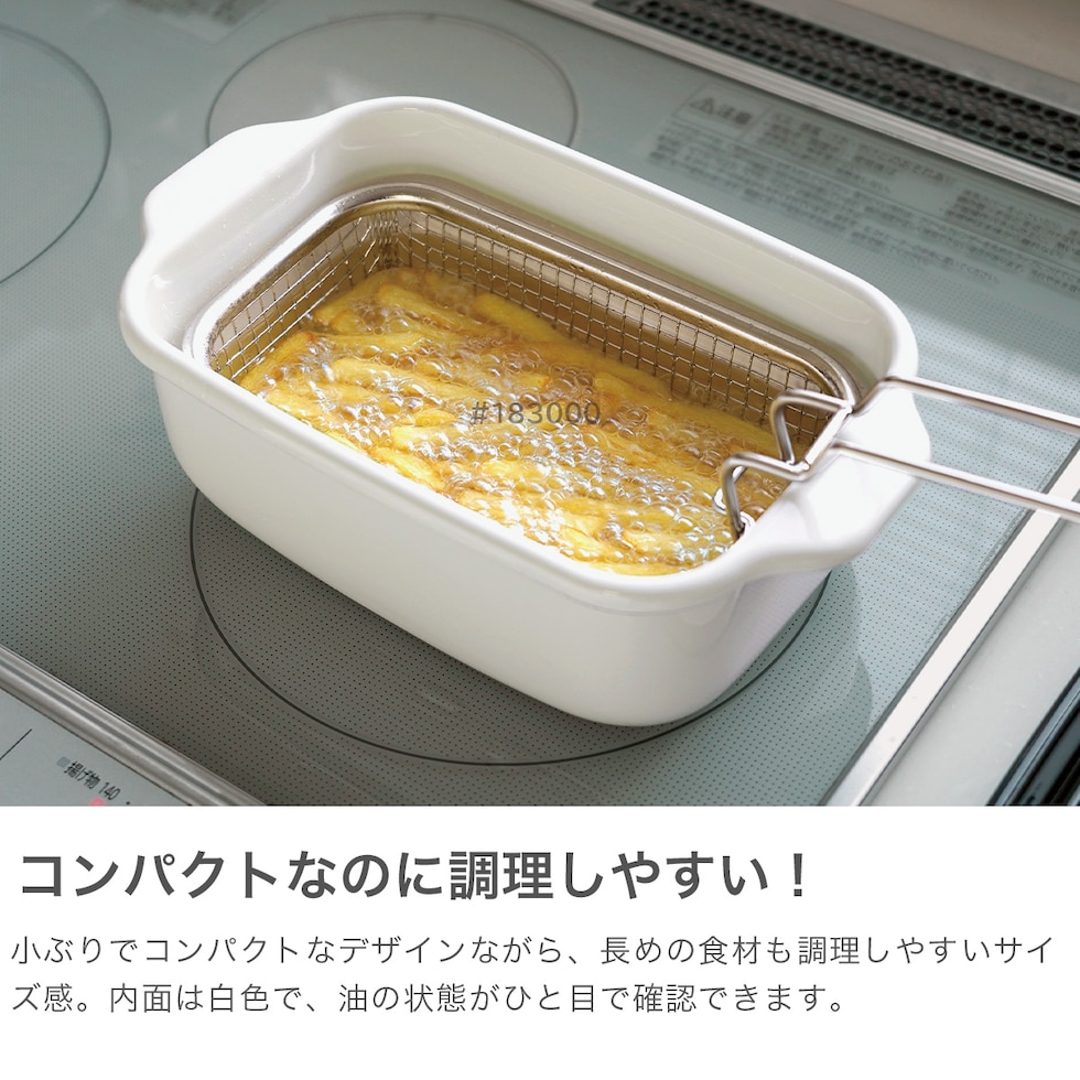 揚げたてを楽しもう♪ SNSで話題の「角型天ぷら鍋」。付属のフライヤーバスケットはフック付きで油切りが簡単!コンパクトながら、長い食材も揚げやすいスリムな形状も魅力です。白色の内面で油の状態が一目で分かり、適温を保ちやすい温度計付きで、揚げ物初心者でも失敗しにくいのがポイント。油汚れもサッと落とせて、防水温度計は丸洗いOKなのでお手入れもしやすくなっています。一人暮らしの方や、ちょっとしたギフトにもオススメです。 |