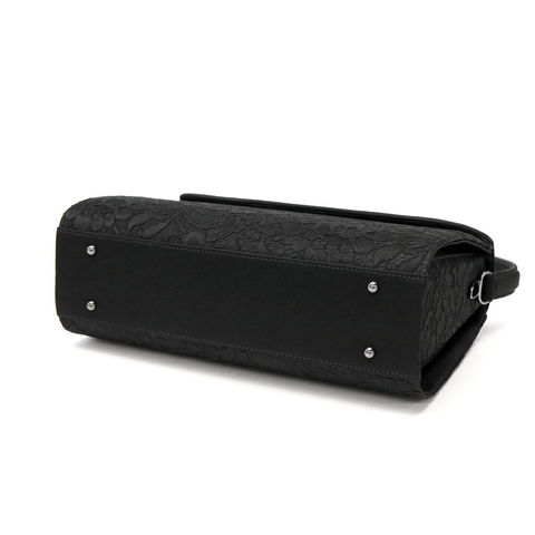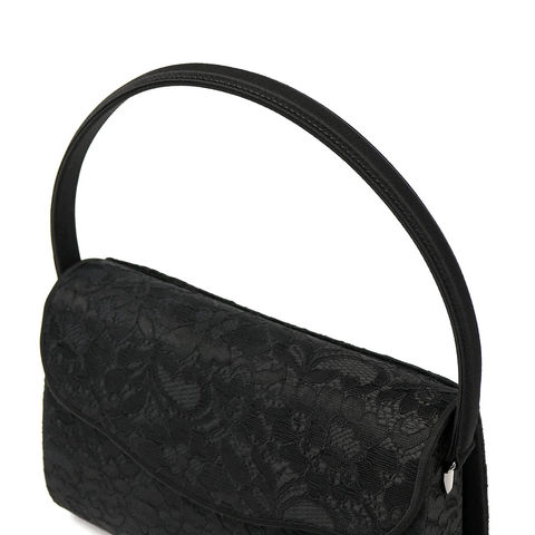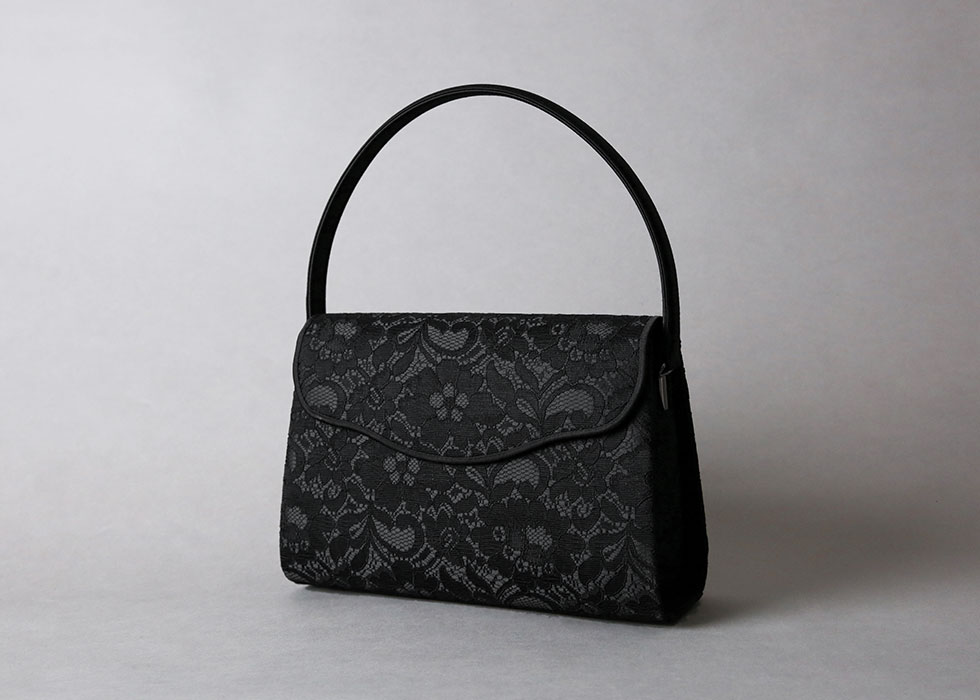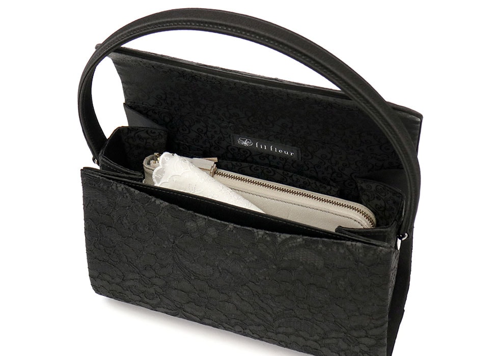 フォーマルシーンにふさわしい上品さと高級感を兼ね備えた、気品たっぷりのフォーマルバッグです。ドレスにも使われるレースをふんだんに使用し、奥ゆかしくもエレガントな印象に仕上げました。内側部分にもこだわり、レース風の花を思わせる柄を、国産のジャガード織で表現した上質な裏地を使用しました。