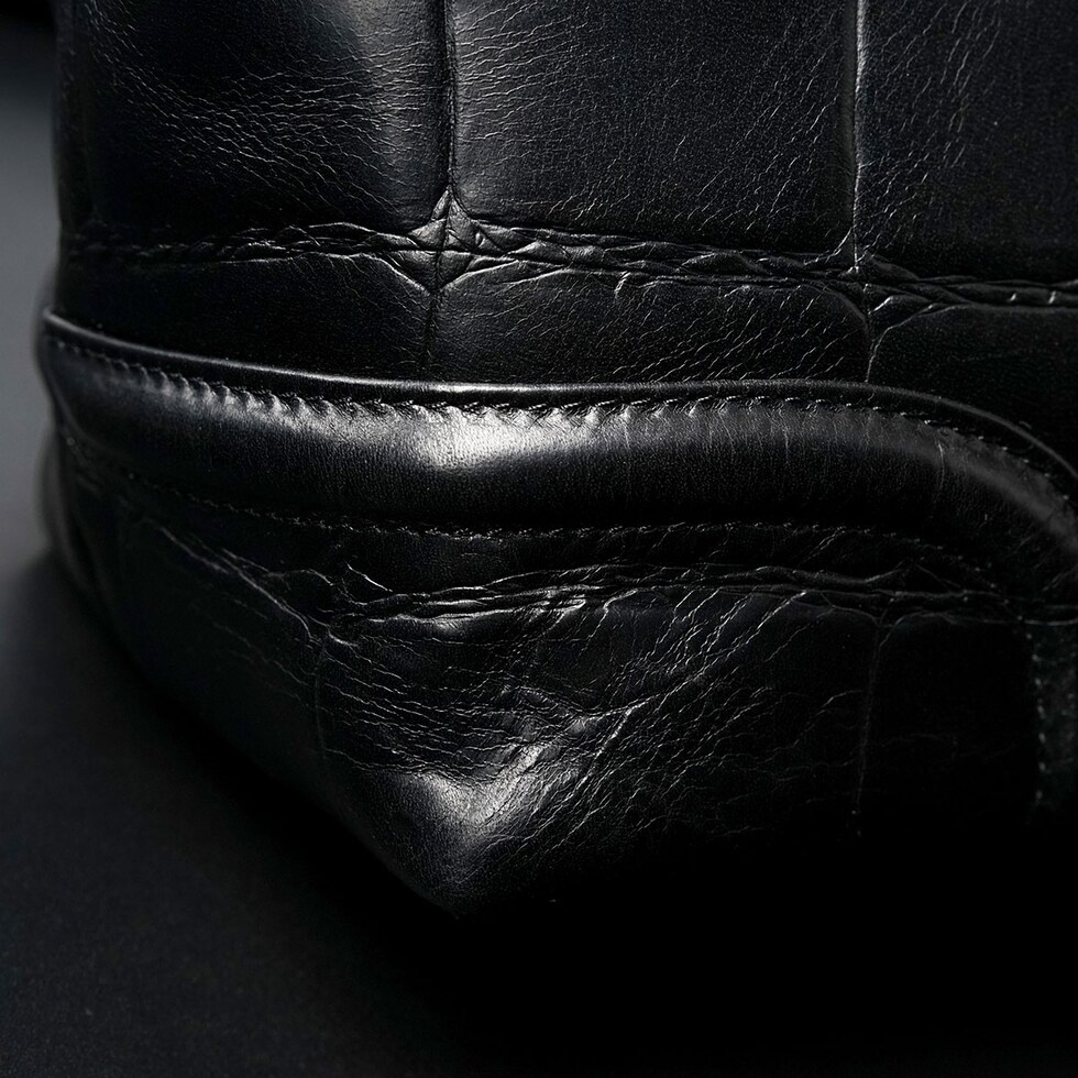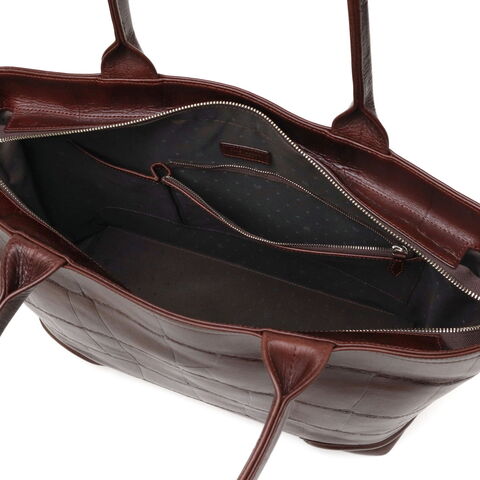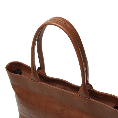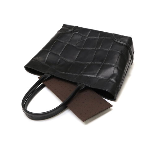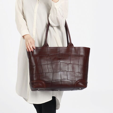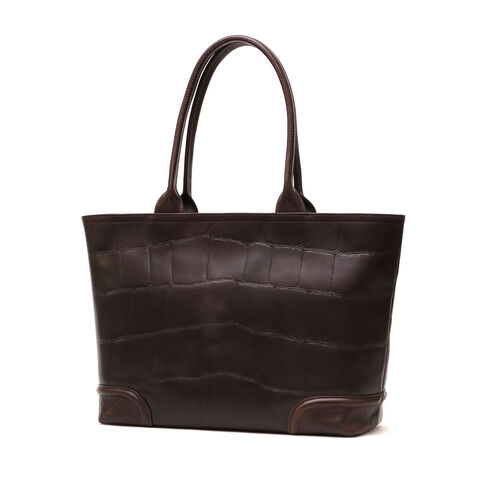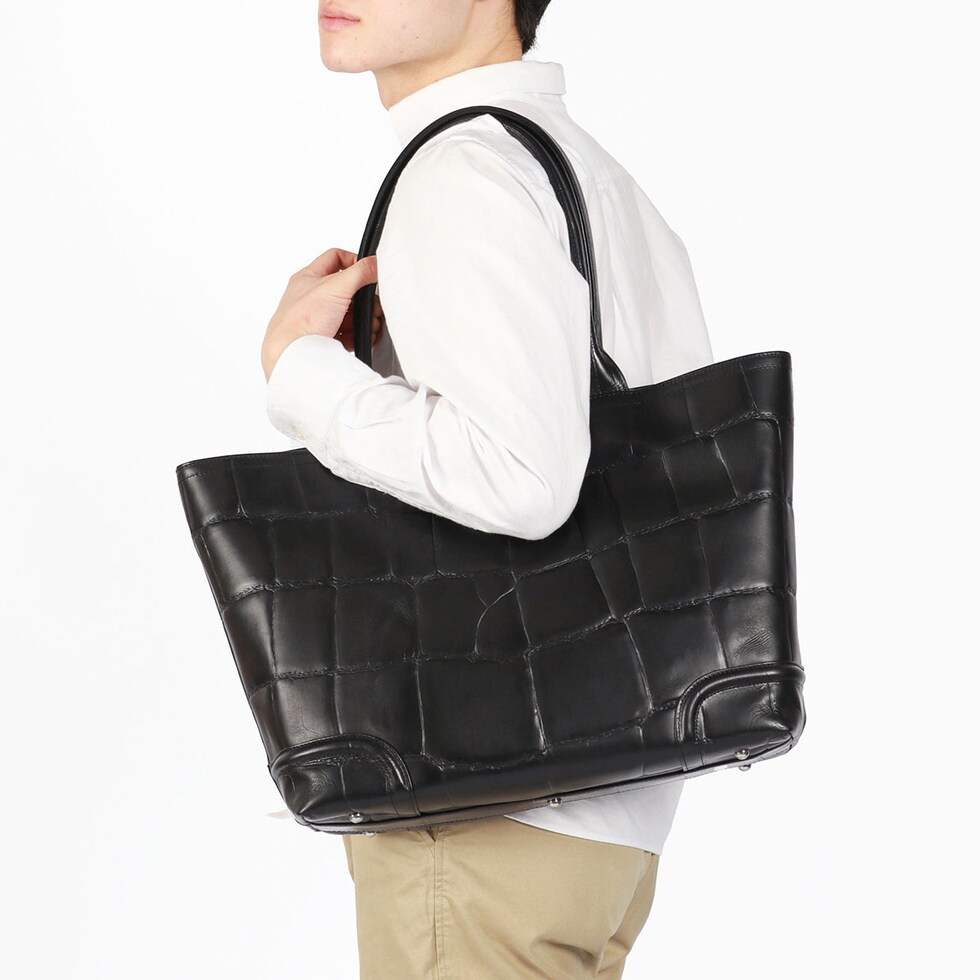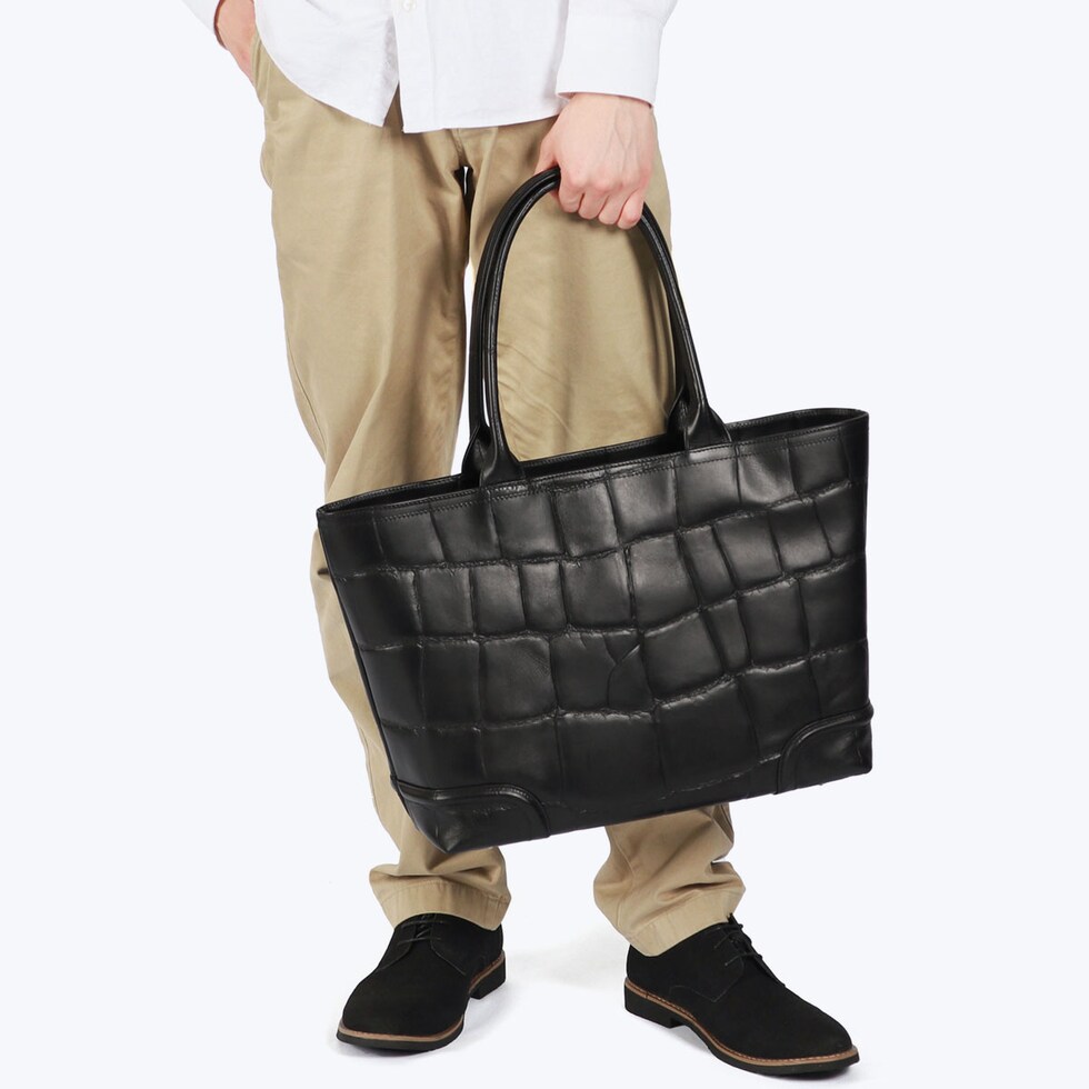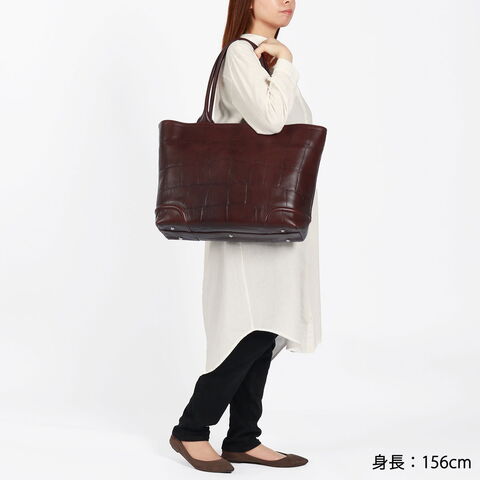 | 大胆なデザインが際立つ 本革トートバッグ 姫路のタンナーで共同開発した『FIVE WOODS』オリジナルのオイルドレザーを大胆にアレンジしたトートバッグ。恐竜の鱗のようなビッグサイズクロコダイルの型押しがシンプルなデザインにアクセントを加えます。使い込んだあとにシボ模様が加味され独特なヴィンテージ感が生まれます。本革ならではの経年変化をお楽しみください。 |