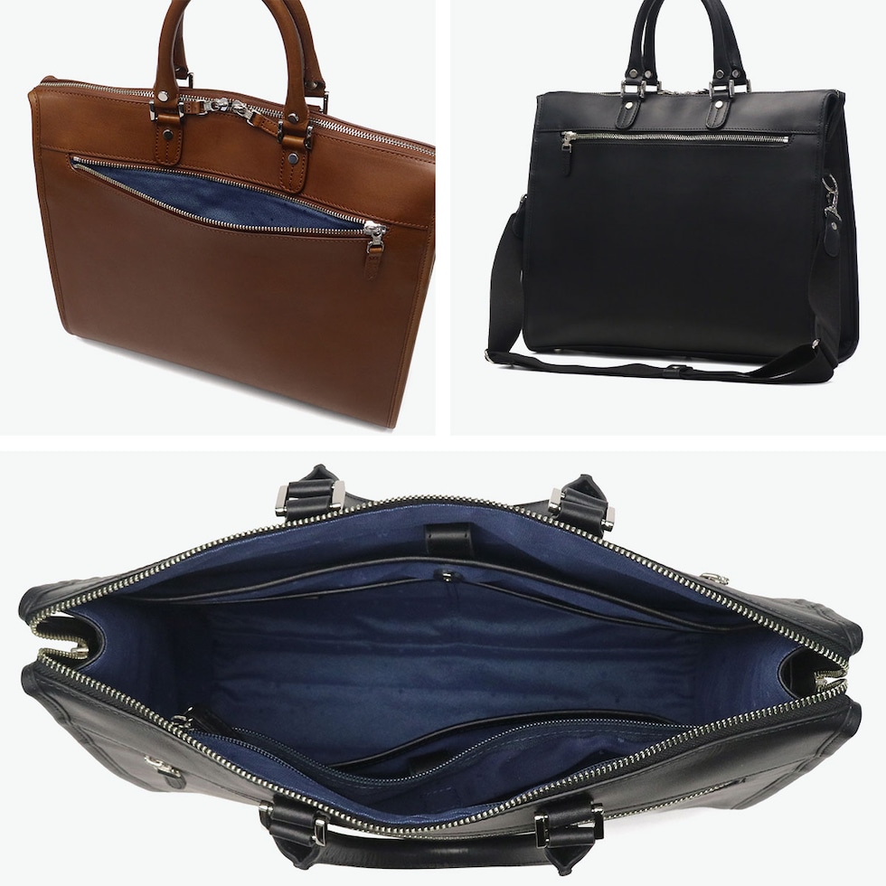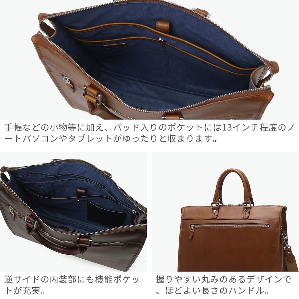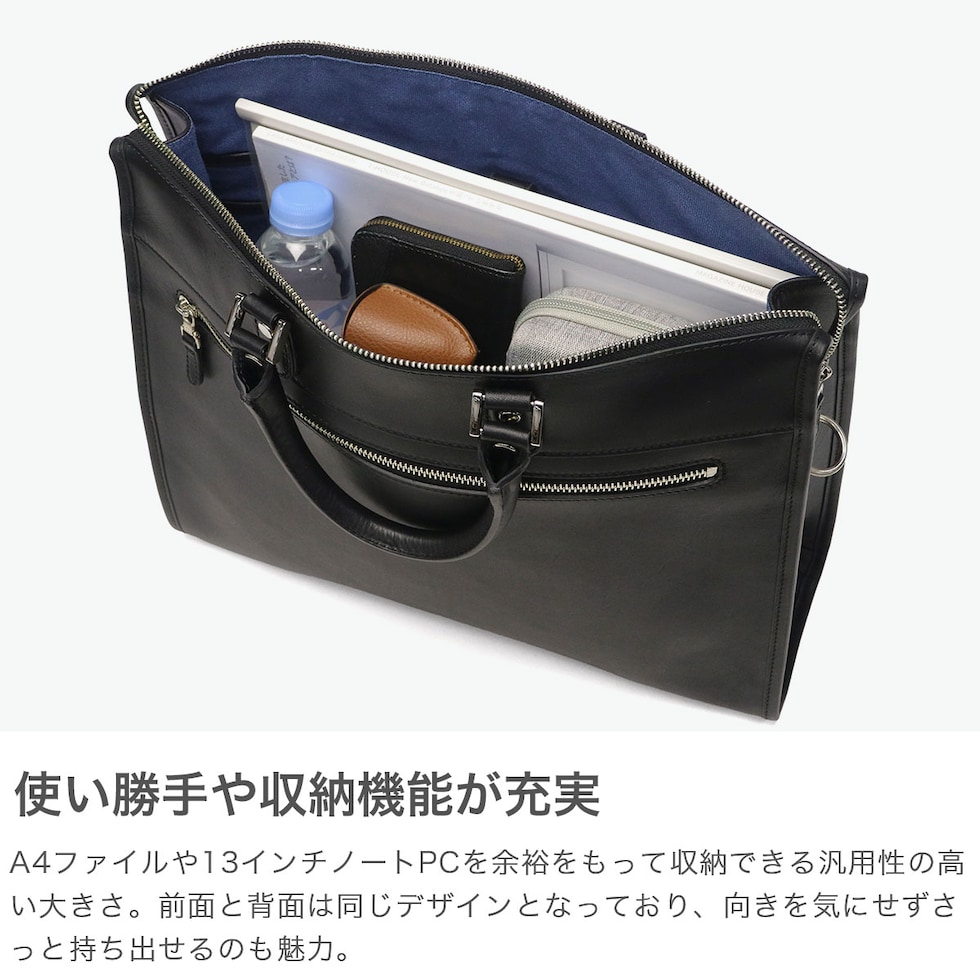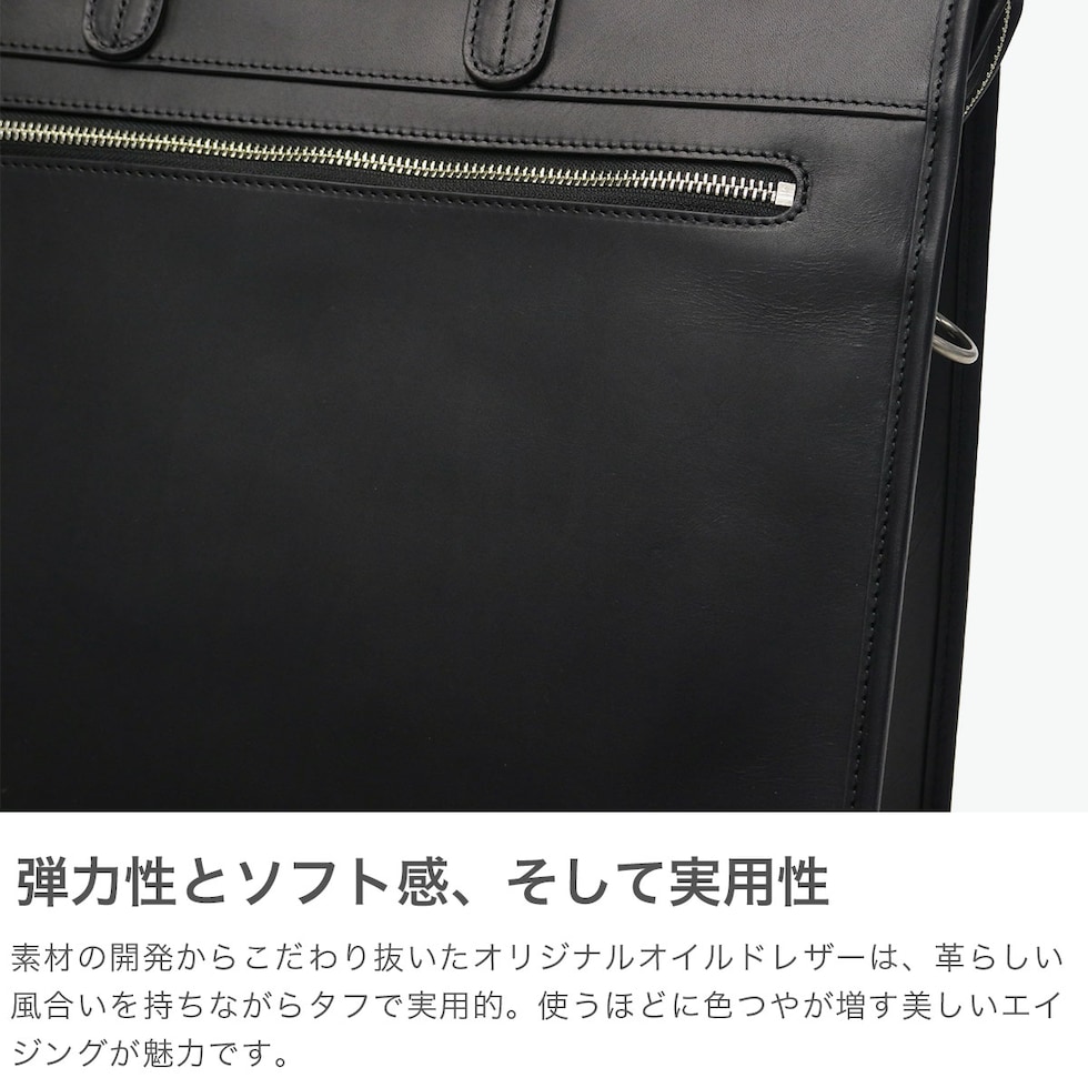 長く愛されるデザイン オリジナルオイルドレザーを贅沢に使用した、ベーシックカジュアルシリーズ『PLATEAU/プラトウ』のA4対応ブリーフケース。直線的なファスナーデザインが引き締まった印象を与え、スマートなビジネススタイルを演出します。自立しやすく耐久性にも配慮したつくりで、ショルダーストラップ付きの2WAY仕様。大きく開くファスナーで荷物の出し入れもスムーズです。13インチPC対応ポケットやペンホルダーなど機能的な収納を備え、多数のビジネスツールを整理しながらスマートに持ち運べる機能的な仕上がりです。 |