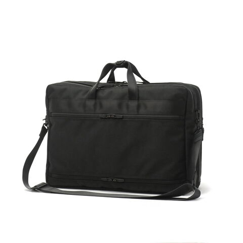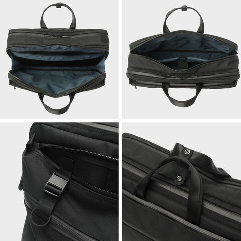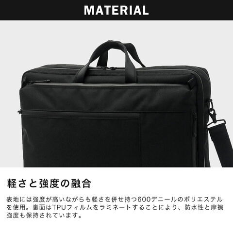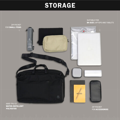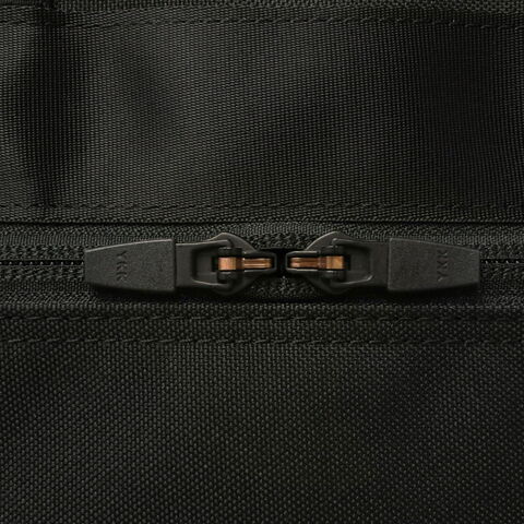 B4サイズのアイテムが収まり、多めの荷物にも対応できるサイズ感の本体。2層に分かれた収納部で、ファイルや書類などの整頓がしやすいつくりとなっています。前面収納部は開閉口がマチ底まで開き、視認性に優れた仕上がりに。背面収納部にはPC収納を搭載し、デバイス類の持ち運びも安心です。内蔵のポケットには伸縮性と強度を備えたパワーメッシュを使用し、かさばる小物も難なく収納可能。また取り外し可能なショルダーストラップを付属しており、シーンに応じて手持ち・肩掛けの2通りのスタイルでお使いいただけます。