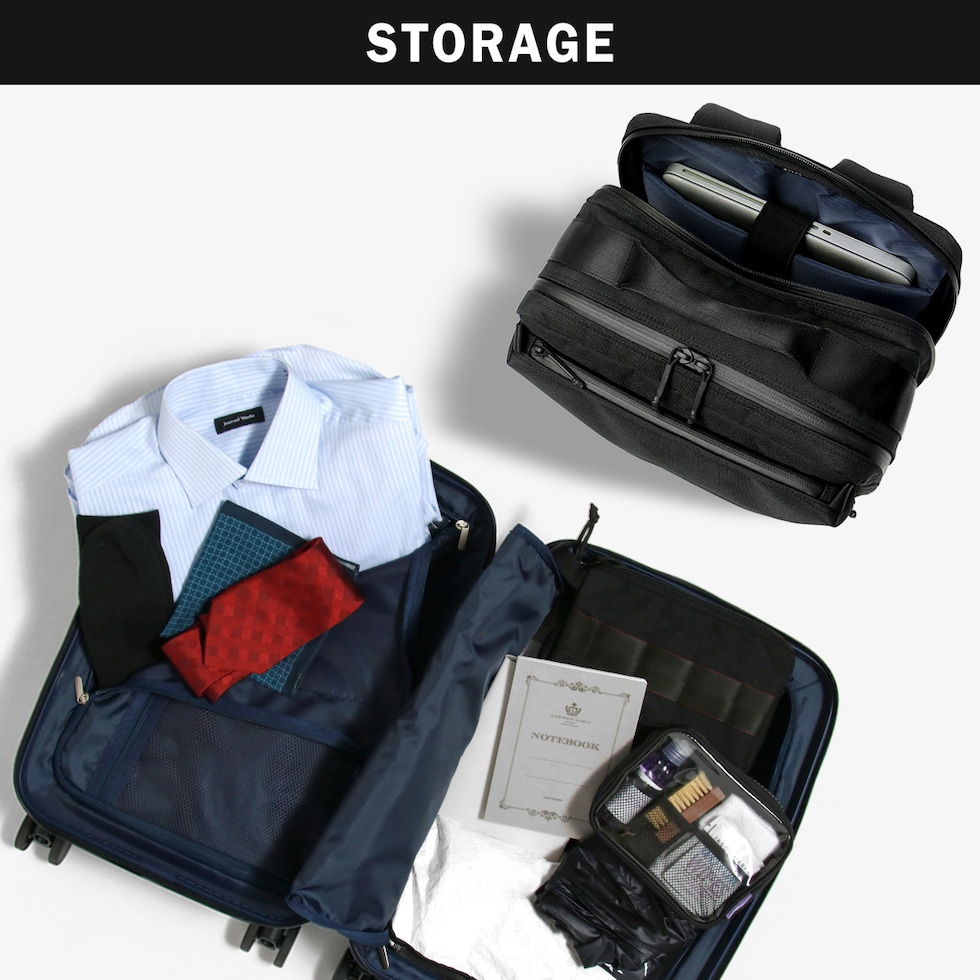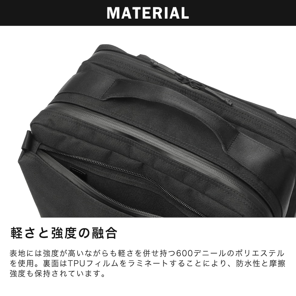 | 仕様 | <外側> PC収納×1 メッシュポケット(M)×2 <内側> ジップ収納×2 メッシュジップポケット(M)×2 ジップポケット(M)×1 ジップポケット(S)×2 <付属品> ロゴ入りクリアポーチ |
