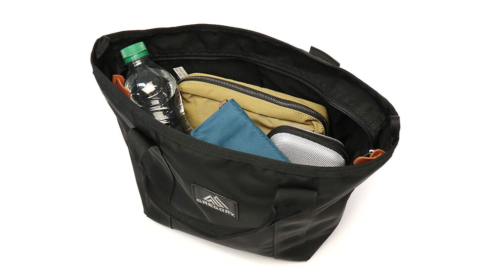 ジップ式で荷物の飛び出しをカバーするだけでなく、大きく開口するデザインによりバッグの中身が一目瞭然。マチを広く備えるメインルームはペットボトルや長財布、ポーチなどの収納に最適。お出かけに必要なアイテムがすっきりまとまる、丁度良いサイズ感です。