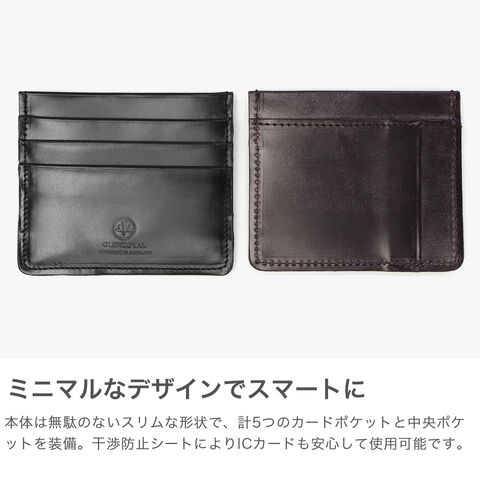 | 英国スタイルを醸す 格調高いカードケース 上質で透明感のあるフルブライドルレザーを使用した『GLENROYAL/グレンロイヤル』のスリムカードケース。レザーの堅牢さと美しい光沢感が大人の品格を醸し出します。キャッシュレス化が進む現代に見合ったミニマルなデザインで、余計なものは持ちたくないスマートなスタイルを求める方におすすめの逸品です。 |