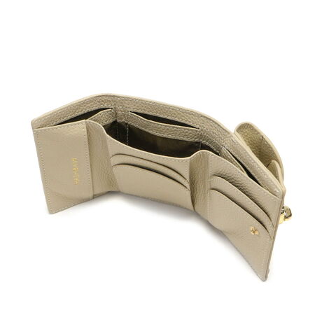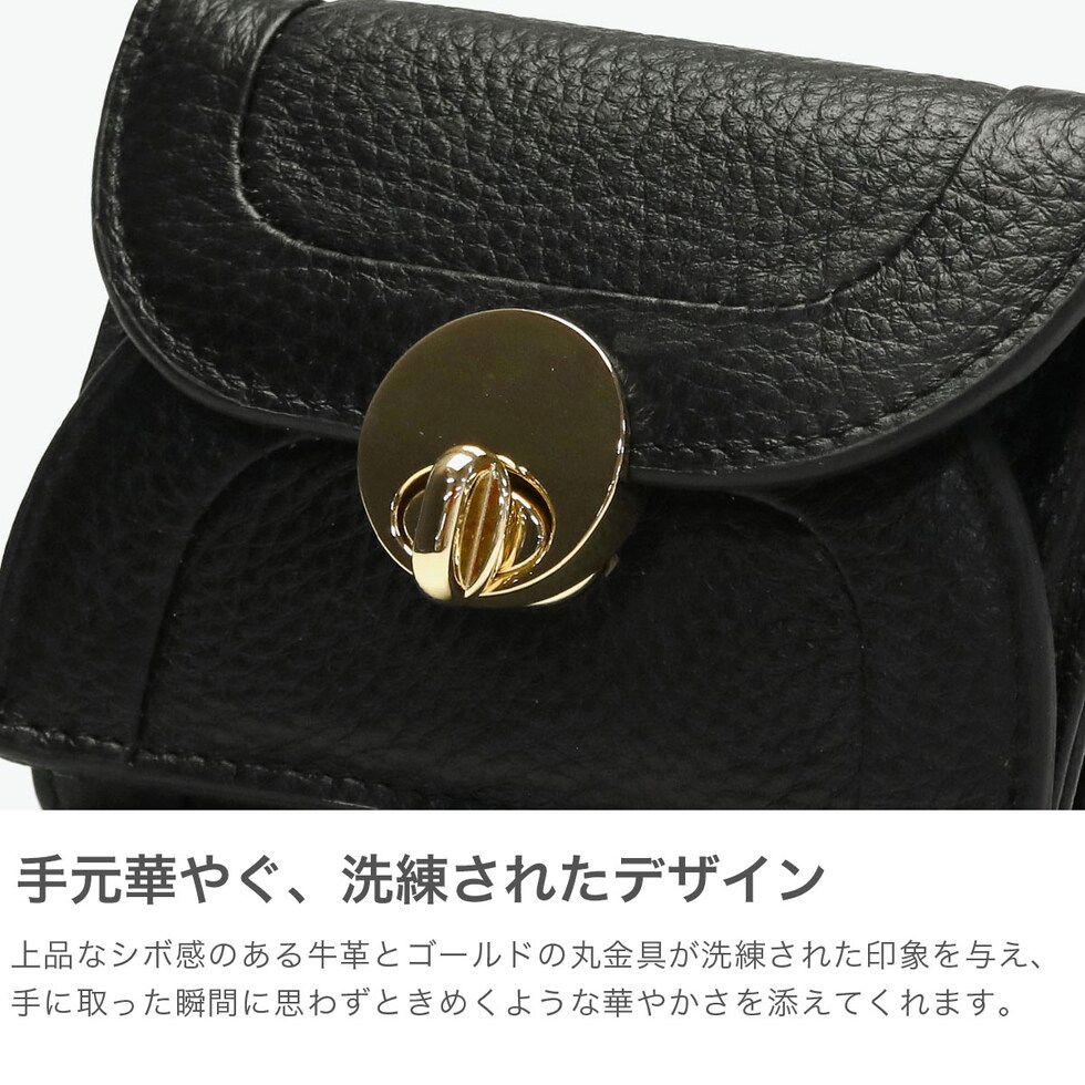 女性らしいデザイン 収納力もデザイン性も兼ね備えた三つ折りミニウォレット。上品なレザーに丸いゴールドの金具をあしらうことで、女性らしさと高級感をプラスしたルックスに仕上がっています。自分用にはもちろん、ギフトにもおすすめのアイテムです。 |