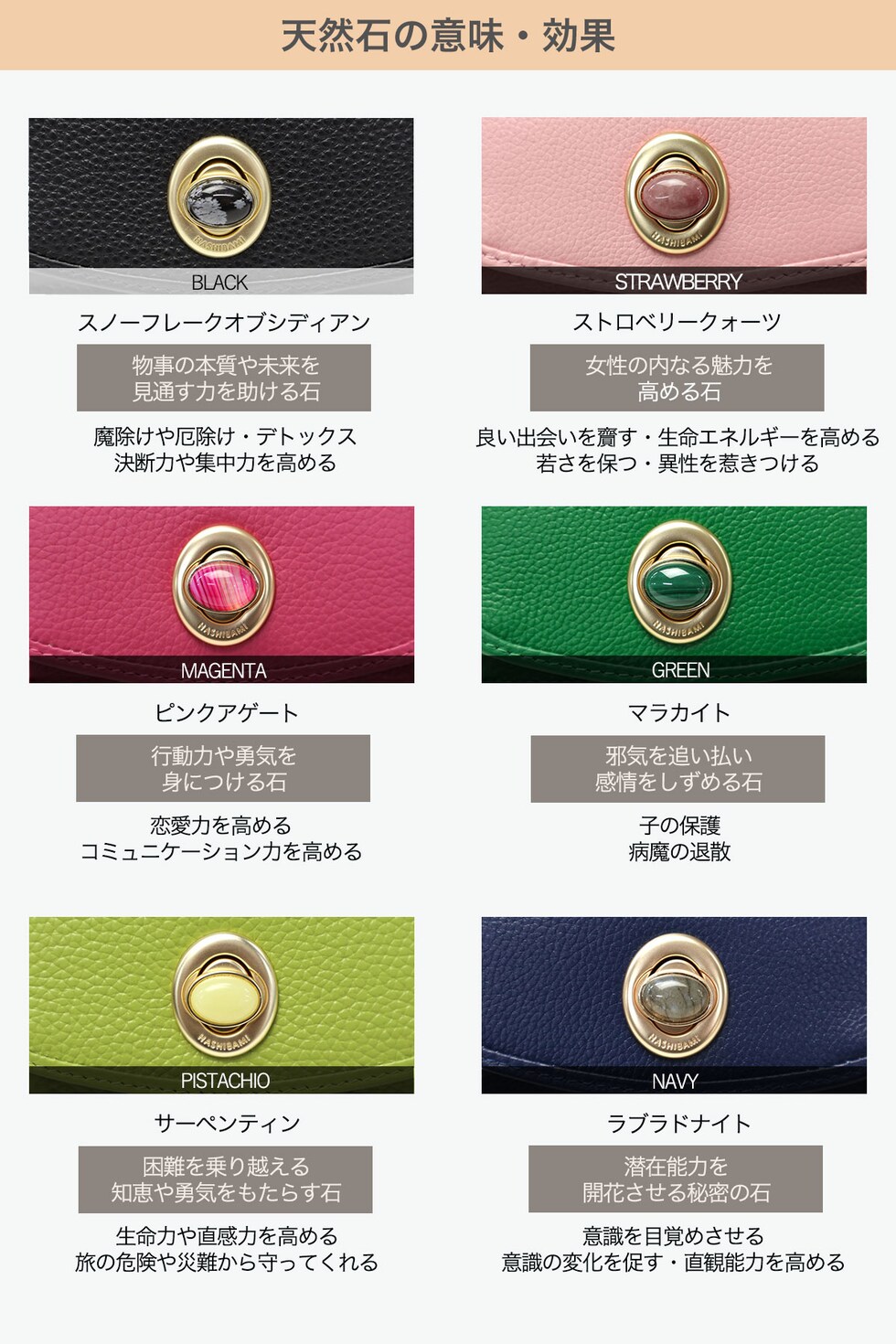 唯一無二の魅力 天然石をあしらった留め具が大人かわいい三つ折り財布。ひとつとして同じものがない天然石を使用し、それぞれの石に意味や効果があるため、自分だけの願いを込めた特別なアイテムになること間違いなしです。流行にとらわれず長くお使いいただけるので、大切な人へのプレゼントにもおすすめとなっております。 |