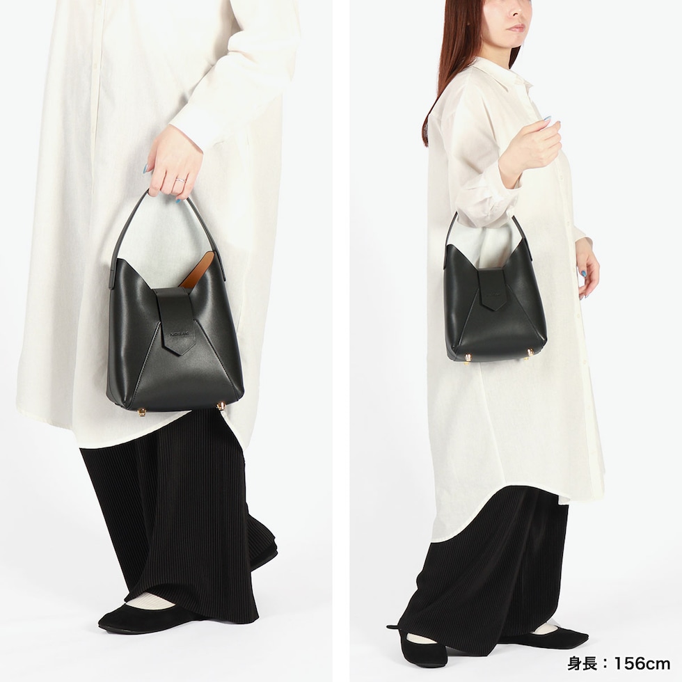 上品なハンドバッグ V字カットの立体的なフォルムが特徴的なワンハンドルバッグ。内部は、財布やポーチなどの必需品が入るサイズ感で、小物用ポケットを1つ搭載しています。収納口が大きく開放されているため、荷物が取り出しやすい設計もポイント。また底鋲が付いているため立てて置くことが可能です。カジュアルからきれいめなど、幅広いコーデに合わせやすいデザインが魅力です。 |
