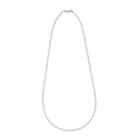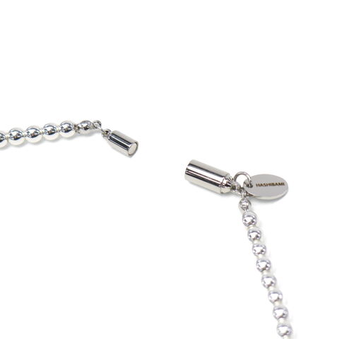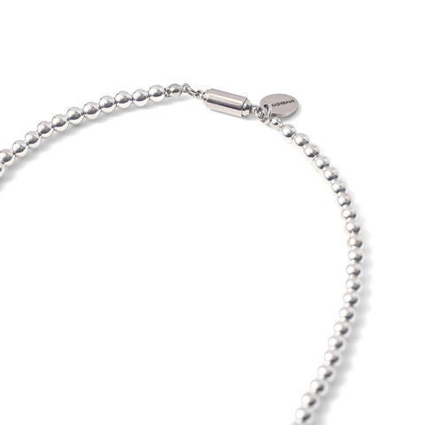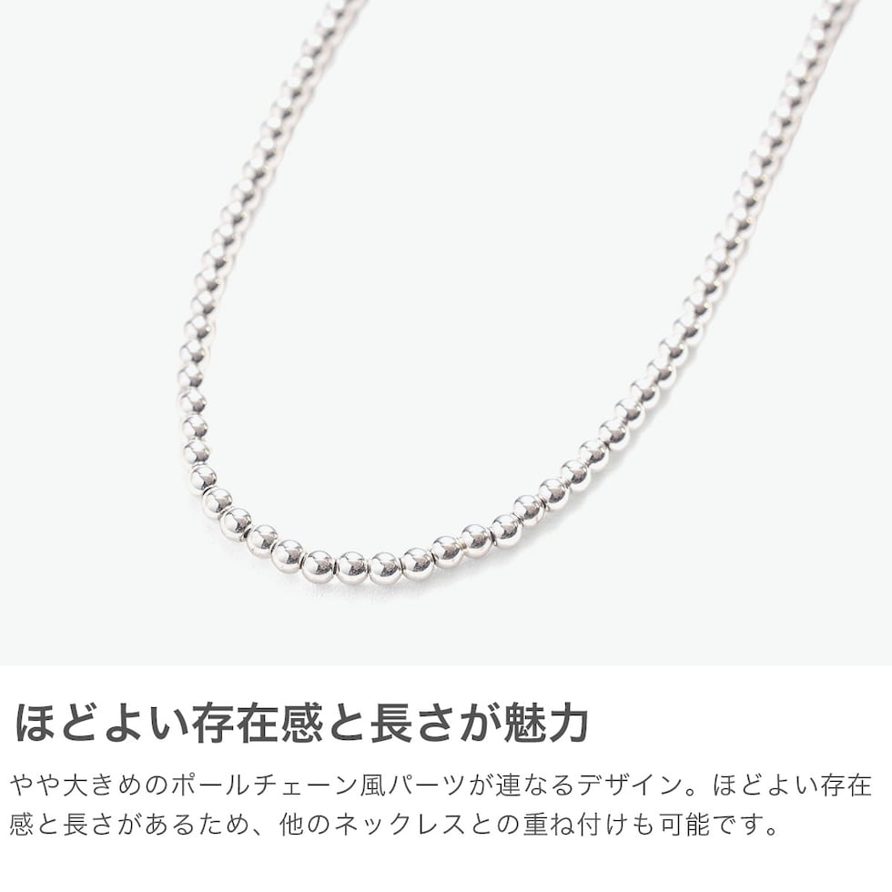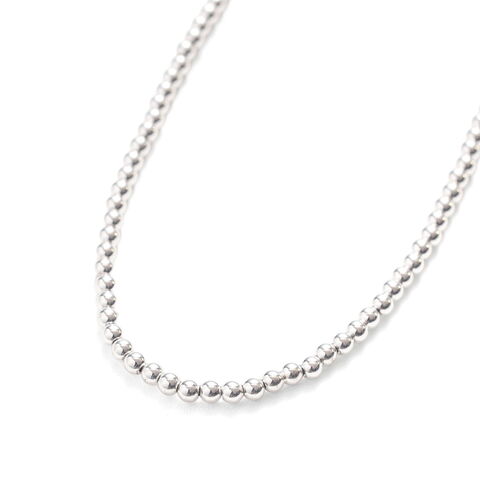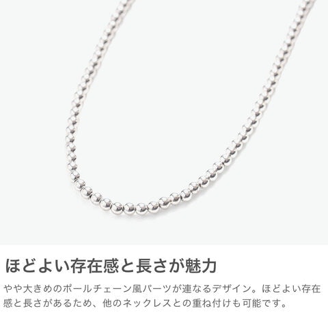 ボールチェーン風 天然石(ヘマタイト)を用いた、オリジナルアクセサリーコレクション。3.5mmサイズのやや大きめのボールチェーン風パーツがポイントのネックレス。シンプルながら上品なシルバーの輝きが存在感を放ちます。一つ一つの粒が首元を美しく彩り、どんな洋服にも映えるアイテムです。 |